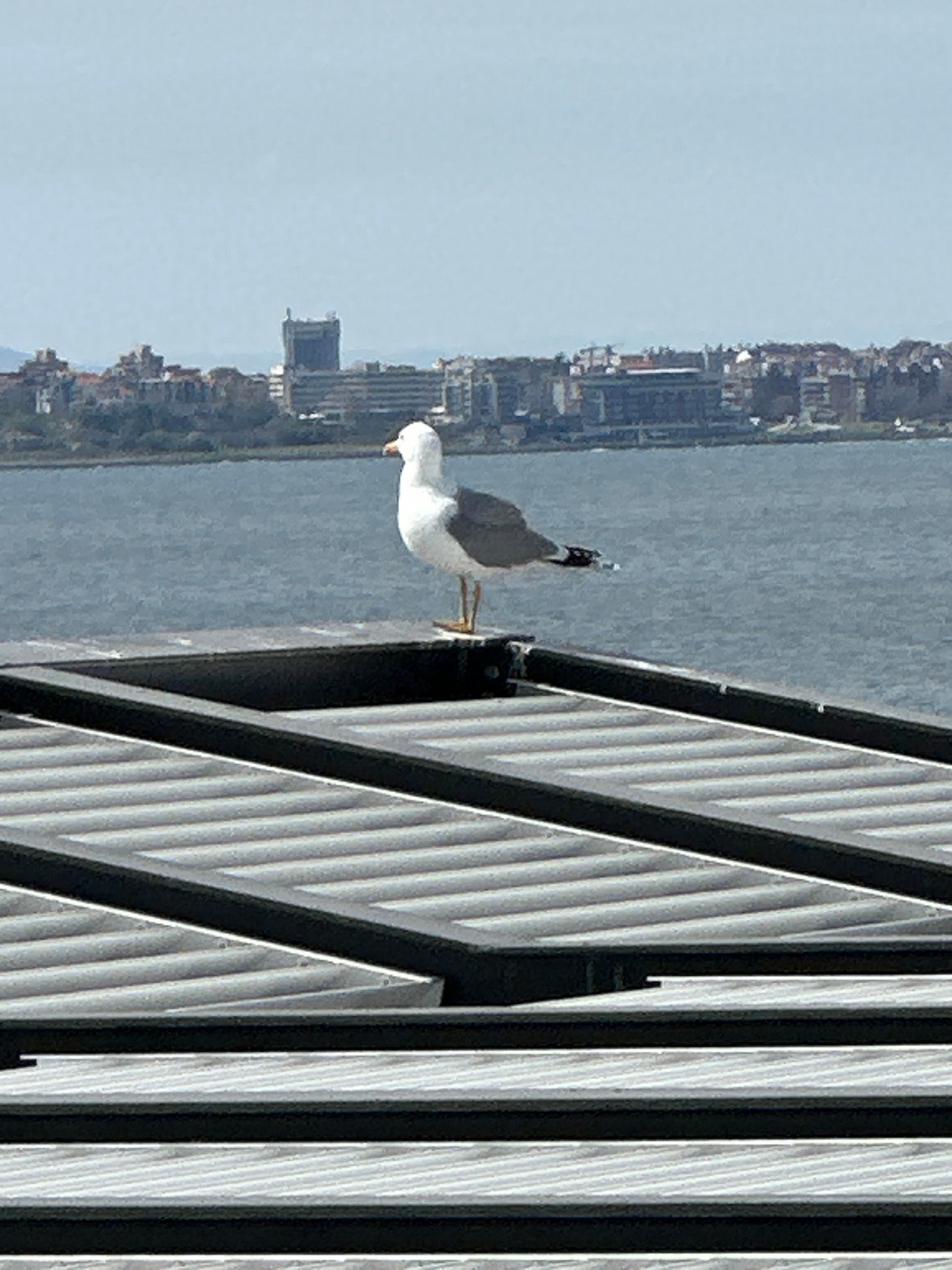 A seagull stands prominently on a dark, horizontal beam of a modern-looking structure. This structure, which occupies the right side of the frame, is characterized by its repeating pattern of dark ver…read more