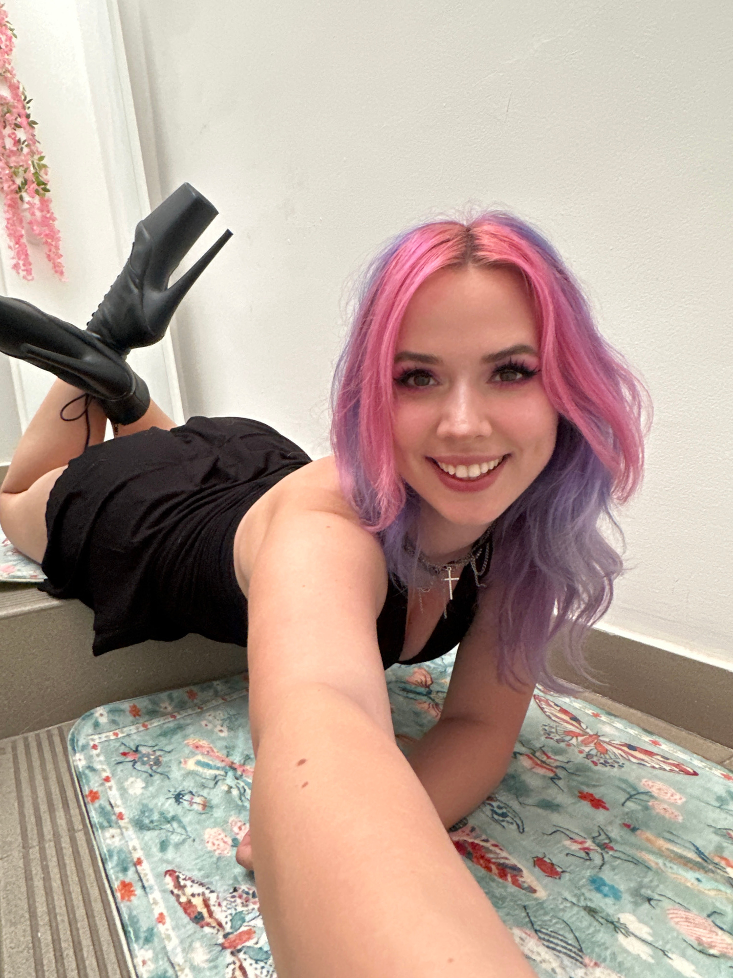 An eye-level portrait features a young woman with long, wavy hair, vibrantly dyed pink at the roots and transitioning to purple. She is smiling broadly, directly at the camera, showcasing her teeth. S…read more