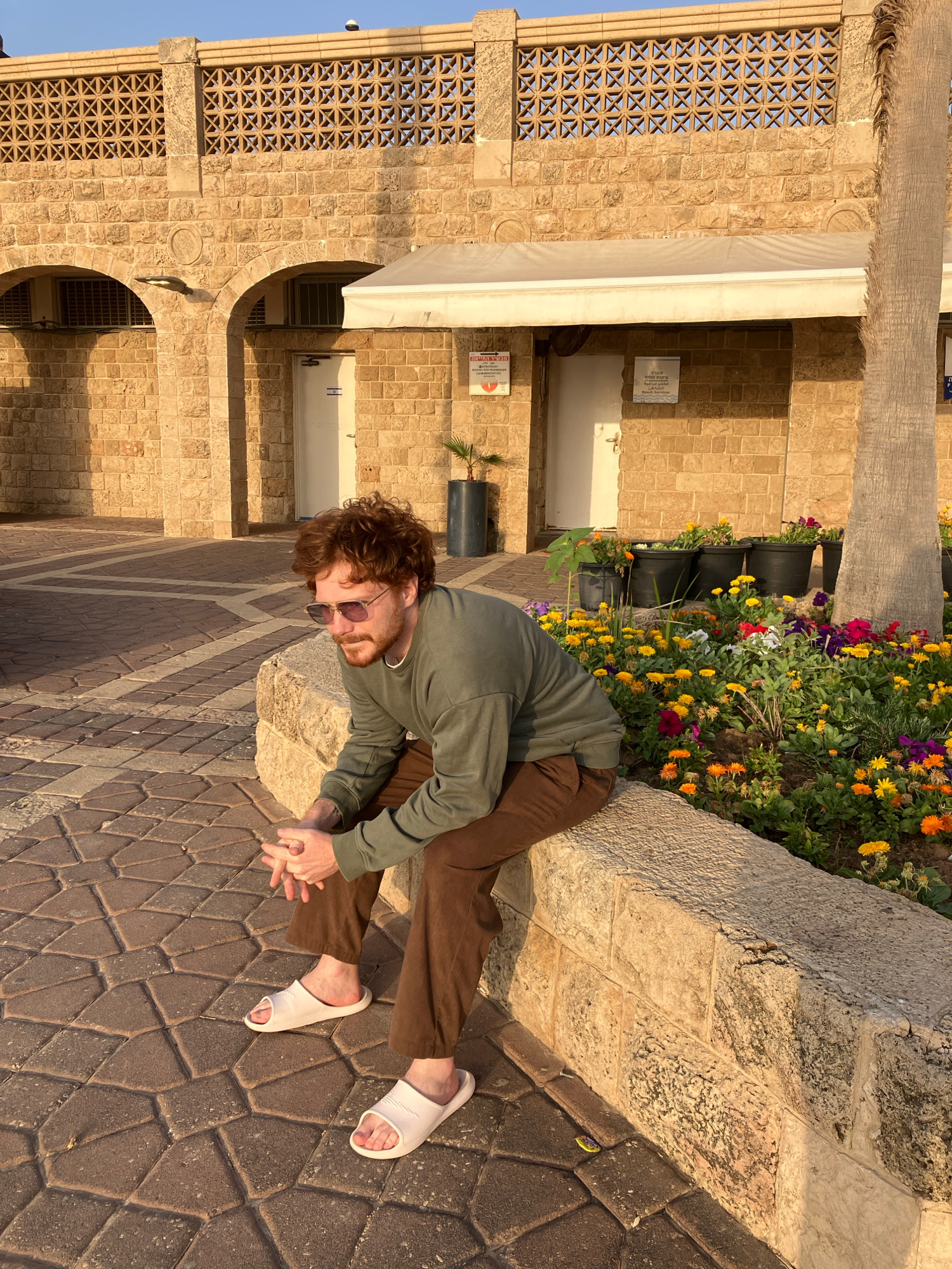A man with light skin, auburn hair, a light beard, and sunglasses is sitting cross-legged on a stone bench in Tel Aviv, Israel. He is wearing a long-sleeved green shirt, brown pants, and white sandalsβ¦read more