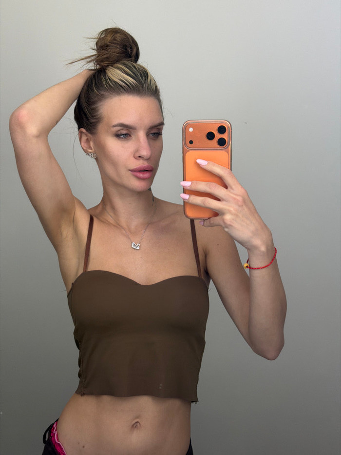 A single female subject is depicted in a mirror selfie or self-portrait. She appears to be an adult in her 20s or 30s, with brunette hair featuring blonde highlights, styled in a messy bun. Her face eā¦read more