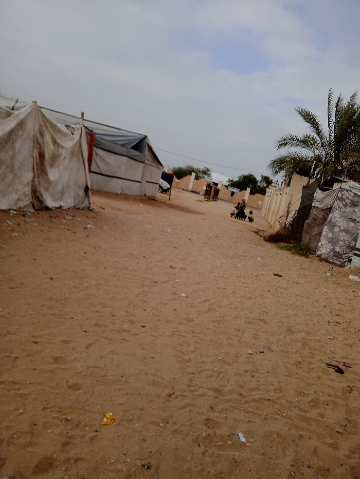 The image depicts an outdoor scene in what appears to be a sandy, arid environment, possibly an informal settlement or camp. The foreground is dominated by a wide expanse of light brown sand, forming…read more