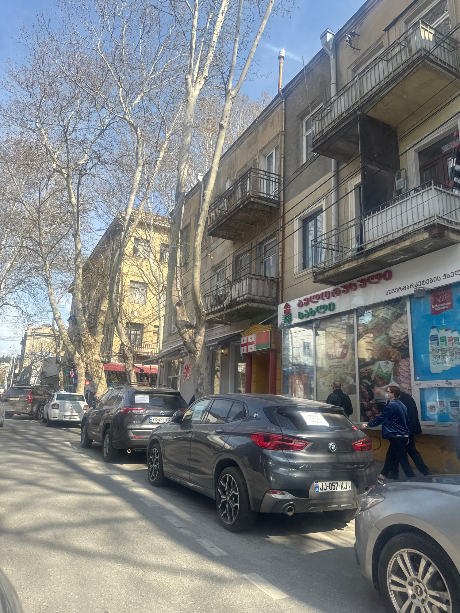 The image captures a street scene in Tbilisi, Georgia. A row of parked cars lines the right side of the street, including a dark-colored BMW with the license plate "JJ-057-KJ" and a dark SUV with the…read more
