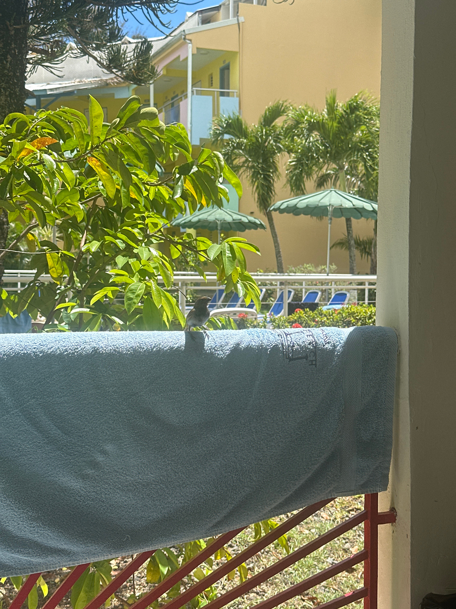 The image presents a view from a balcony in Le Gosier, France. The focus is a folded light blue towel hanging from a red iron railing. Beyond the towel, a lush green tree with vibrant leaves is visibl…read more