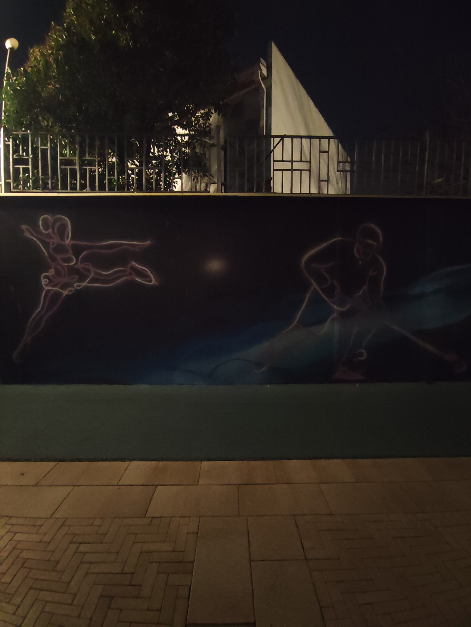 A night scene presents a dark background with a street lamp illuminating a wall bearing two distinct neon-style drawings. On the left, there is a depiction of a human figure in mid-leap. To the right,…read more