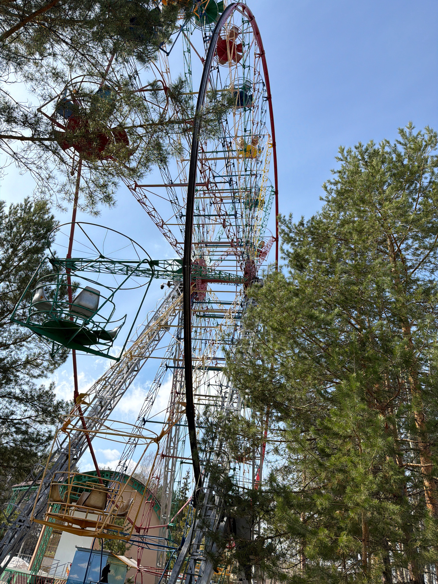 The image depicts a Ferris wheel in the city of Chaikovsky, Russia, taken from a low angle, looking up. The Ferris wheel is colorful with red, yellow, green, and blue elements. Some of the passenger c…read more
