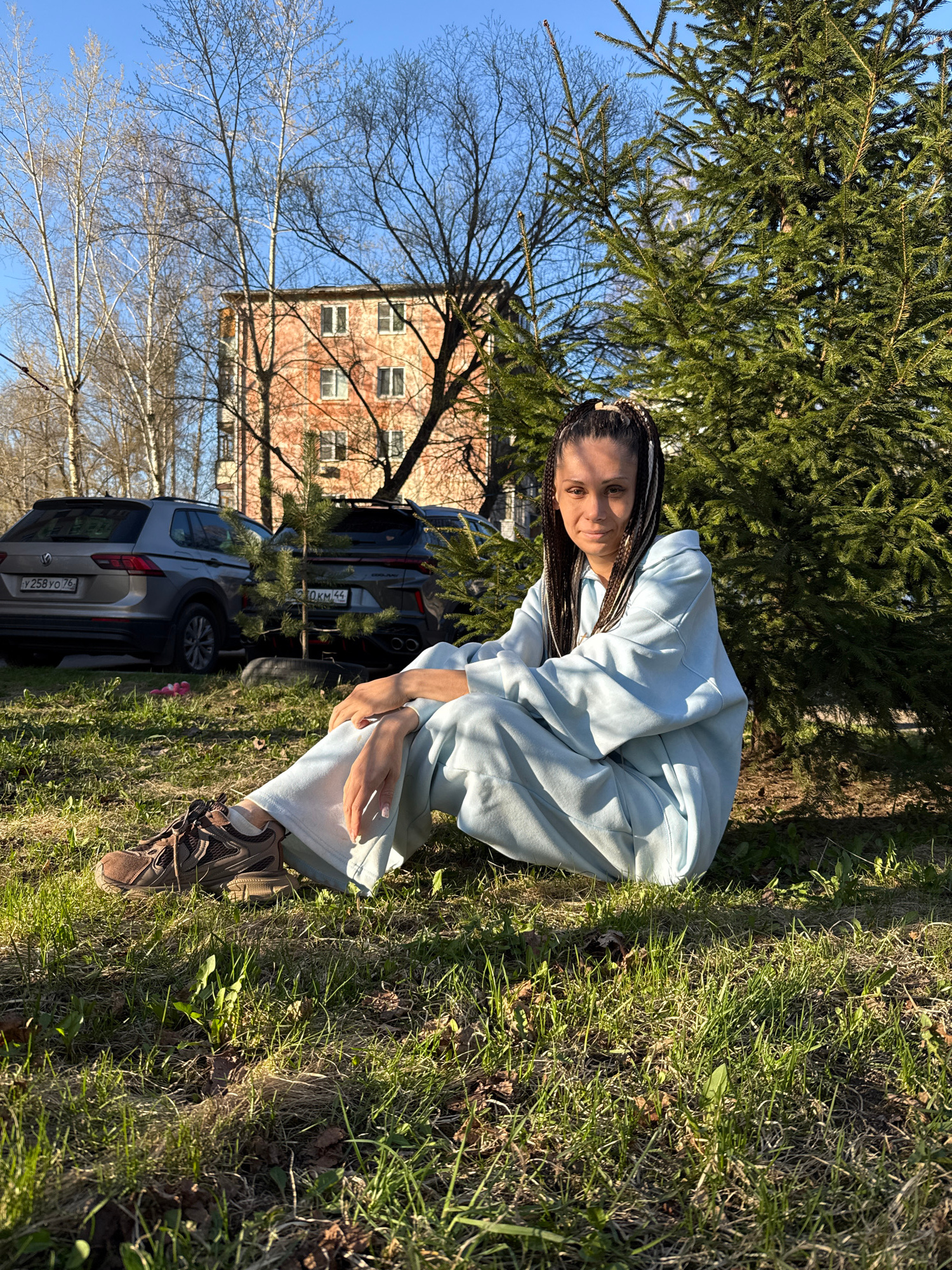 A woman is captured in a squatting or crouching pose on a grassy patch of ground under a clear blue sky. She is positioned slightly to the right of the center in the foreground. She has long, dark braβ¦read more
