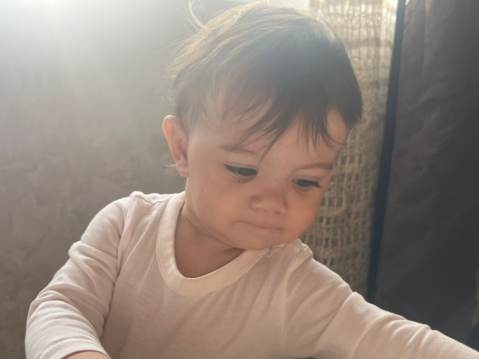 A light-skinned infant or toddler with dark brown hair is depicted from the upper chest upwards, positioned off-center in a vertical composition. The individual wears a plain, light-colored, long-slee…read more