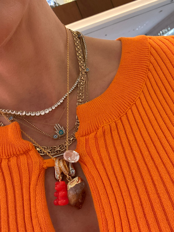An image focuses on a person wearing an orange ribbed top. Several gold necklaces with various pendants adorn the neck. A wide chain necklace sits highest, followed by a diamond tennis necklace and a…read more