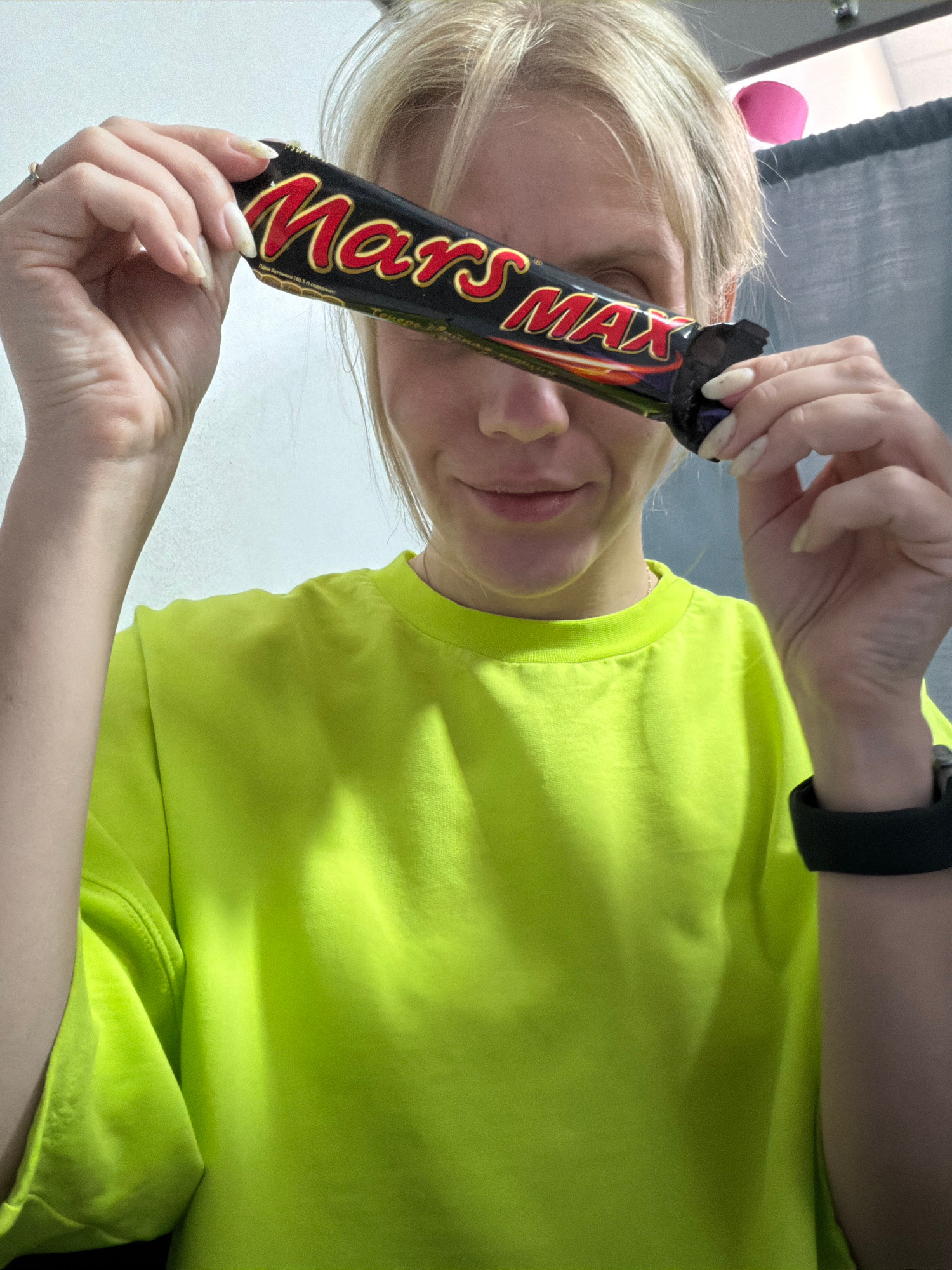 A blonde-haired woman wearing a bright green shirt and a black smart watch is holding a Mars MAX chocolate bar in front of her face. The background appears to be a domestic interior. The location is n…read more