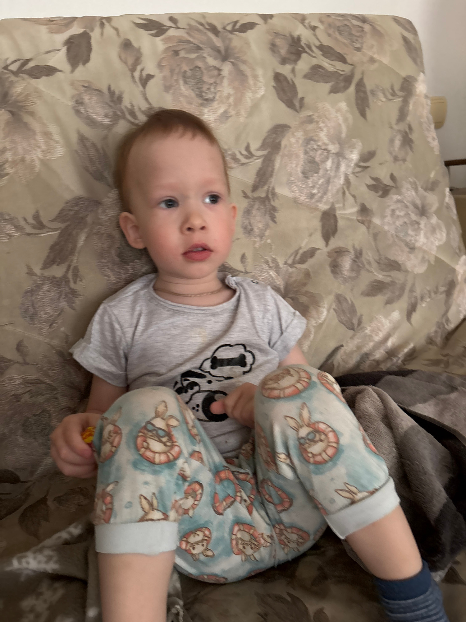 A young child lies on a floral patterned couch, covered partially by a brown blanket. The child wears a grey shirt with a black and white design and light blue pants with cartoon rabbits. The child's…read more
