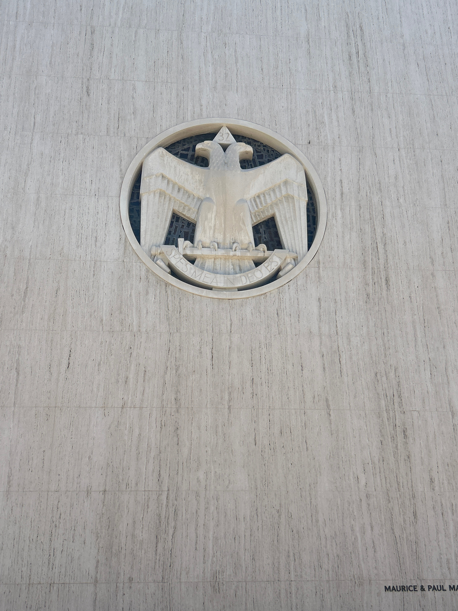 The image depicts a close-up view of a circular emblem affixed to a wall with a light-gray, striated texture. The emblem contains a stylized bird figure oriented towards the left, encircled by letteri…read more