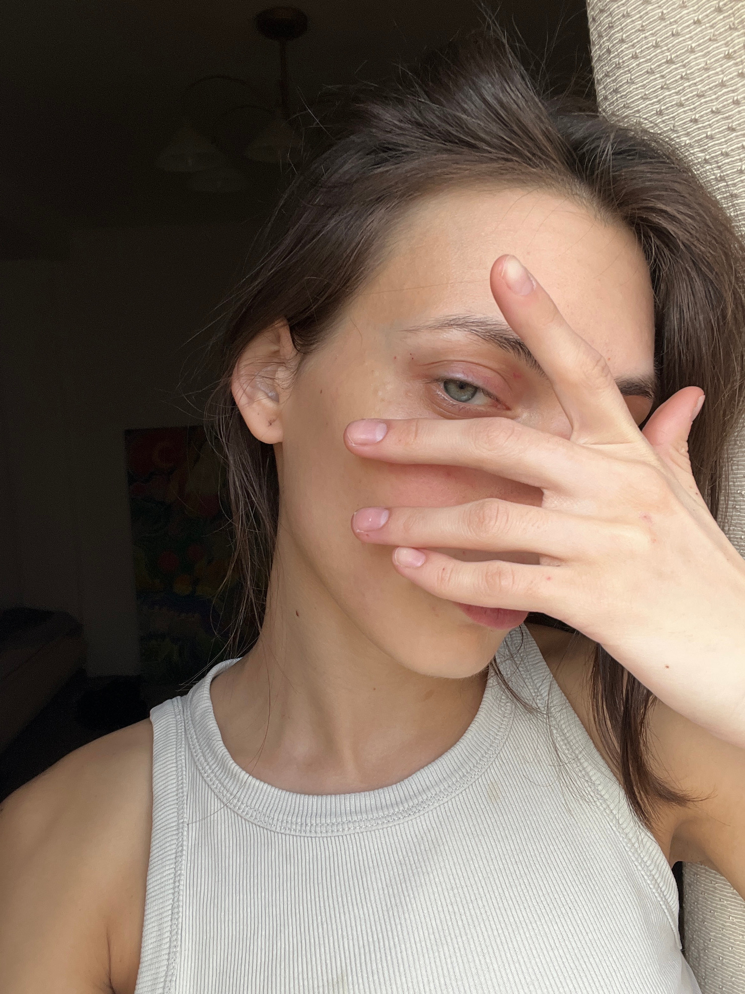 This media file presents a close-up, angled portrait of a person, likely female, indoors in Krasnoyarsk, Russia. The subject has fair skin, dark brown hair, and a striking green eye that is clearly vi…read more
