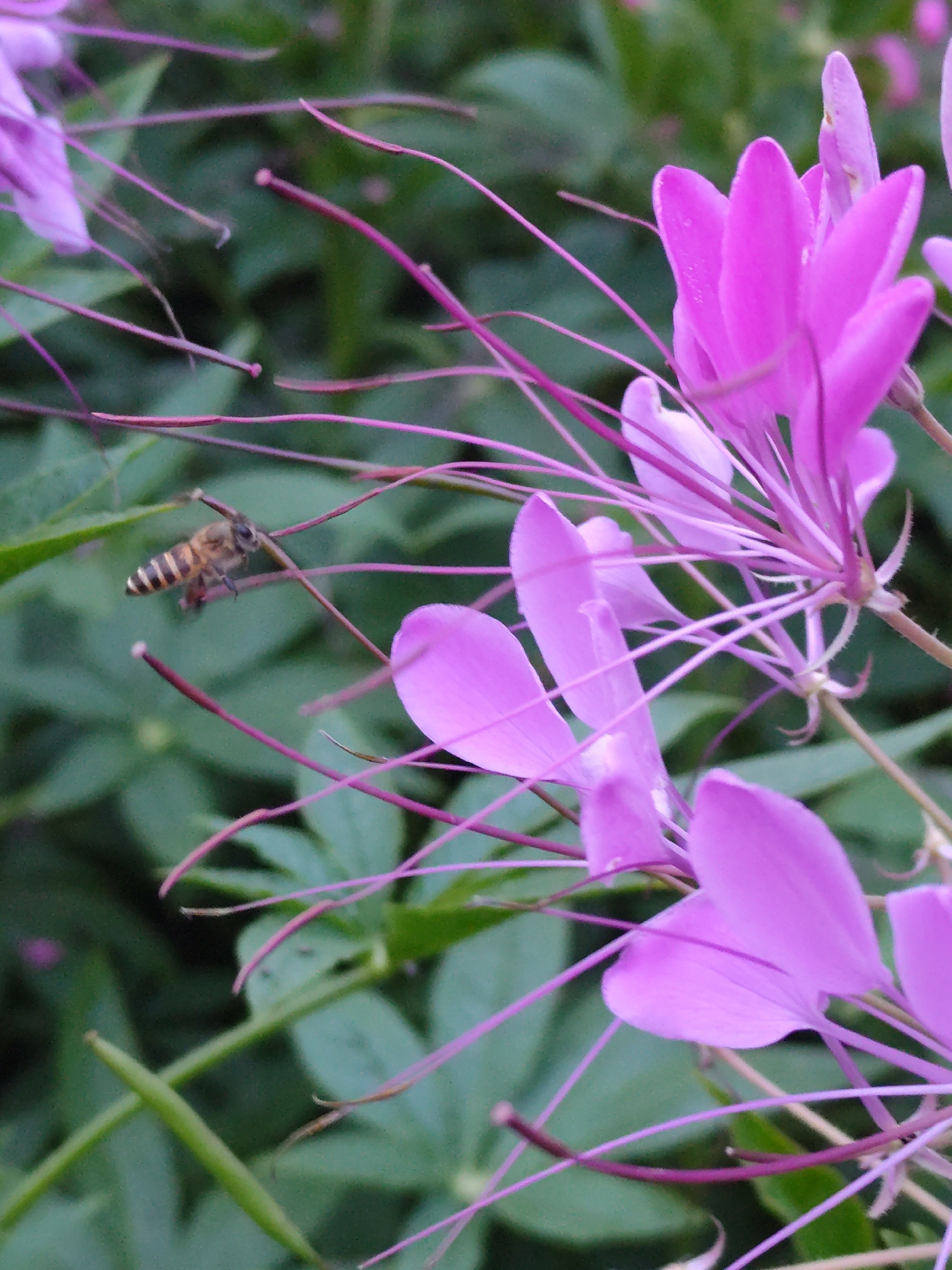 A bee is in flight near pink flowers in a garden, likely in Da Lat, Vietnam. The background consists of green foliage. The bee has a striped abdomen and is captured mid-flight. The pink flowers have l…read more