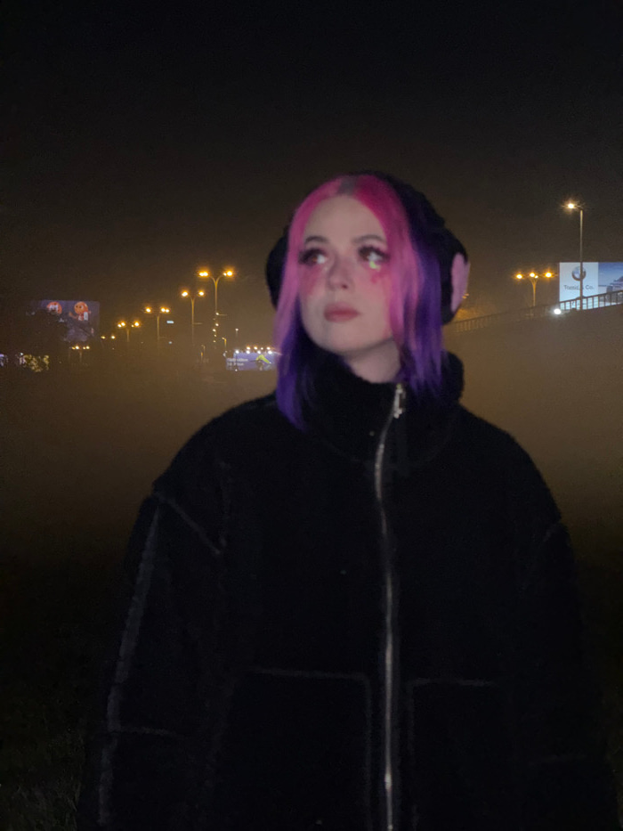 A young female stands slightly right of center in an outdoor, nighttime scene in the City of Zagreb, Croatia, obscured by fog or haze. She has long hair, dyed pink on her right side and purple on her…read more
