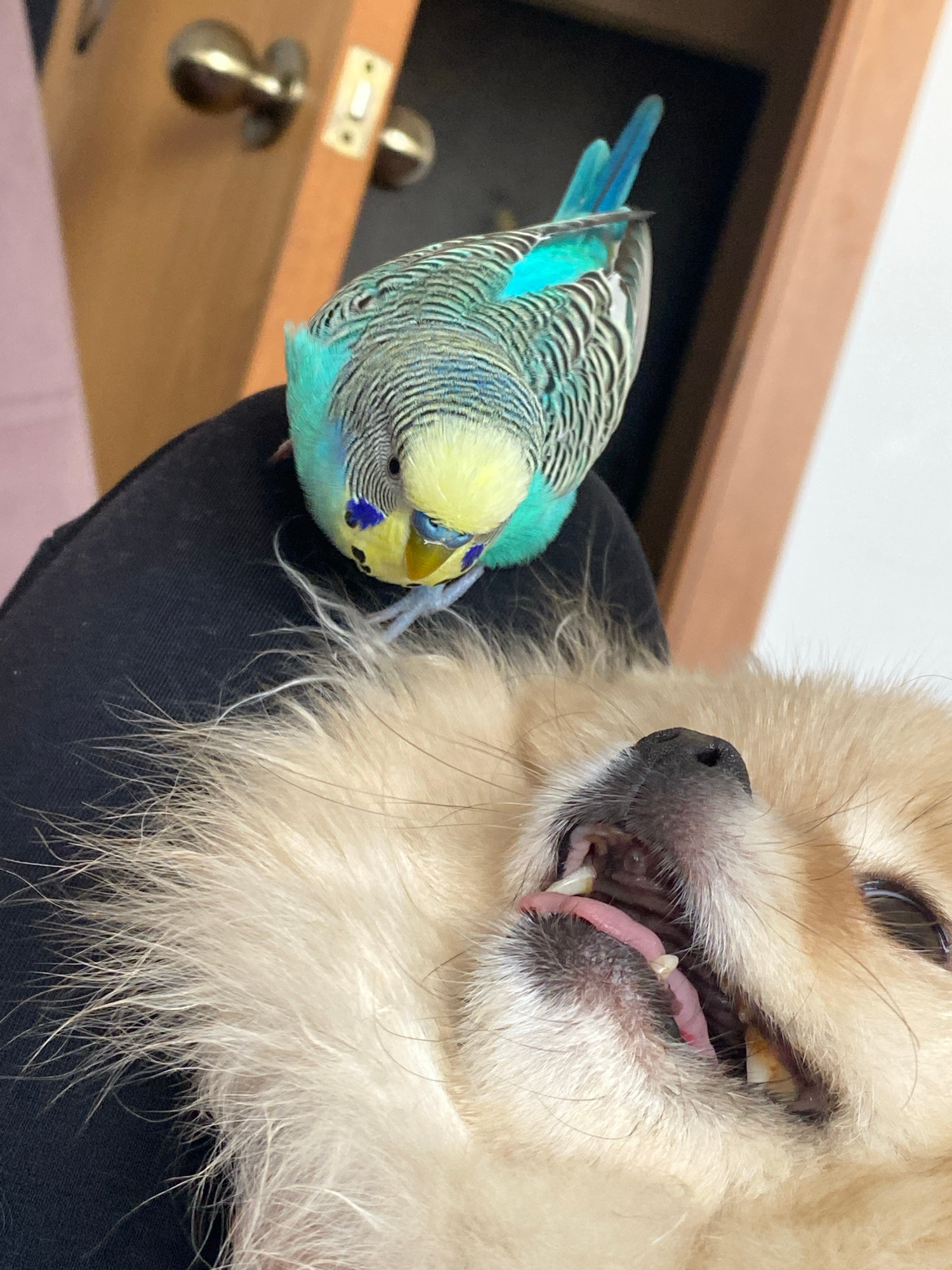 A parakeet with light blue and green plumage perches on a person's arm, closely positioned next to a tan-colored Pomeranian dog. The dog's mouth is slightly open, revealing its teeth. The scene is ind…read more