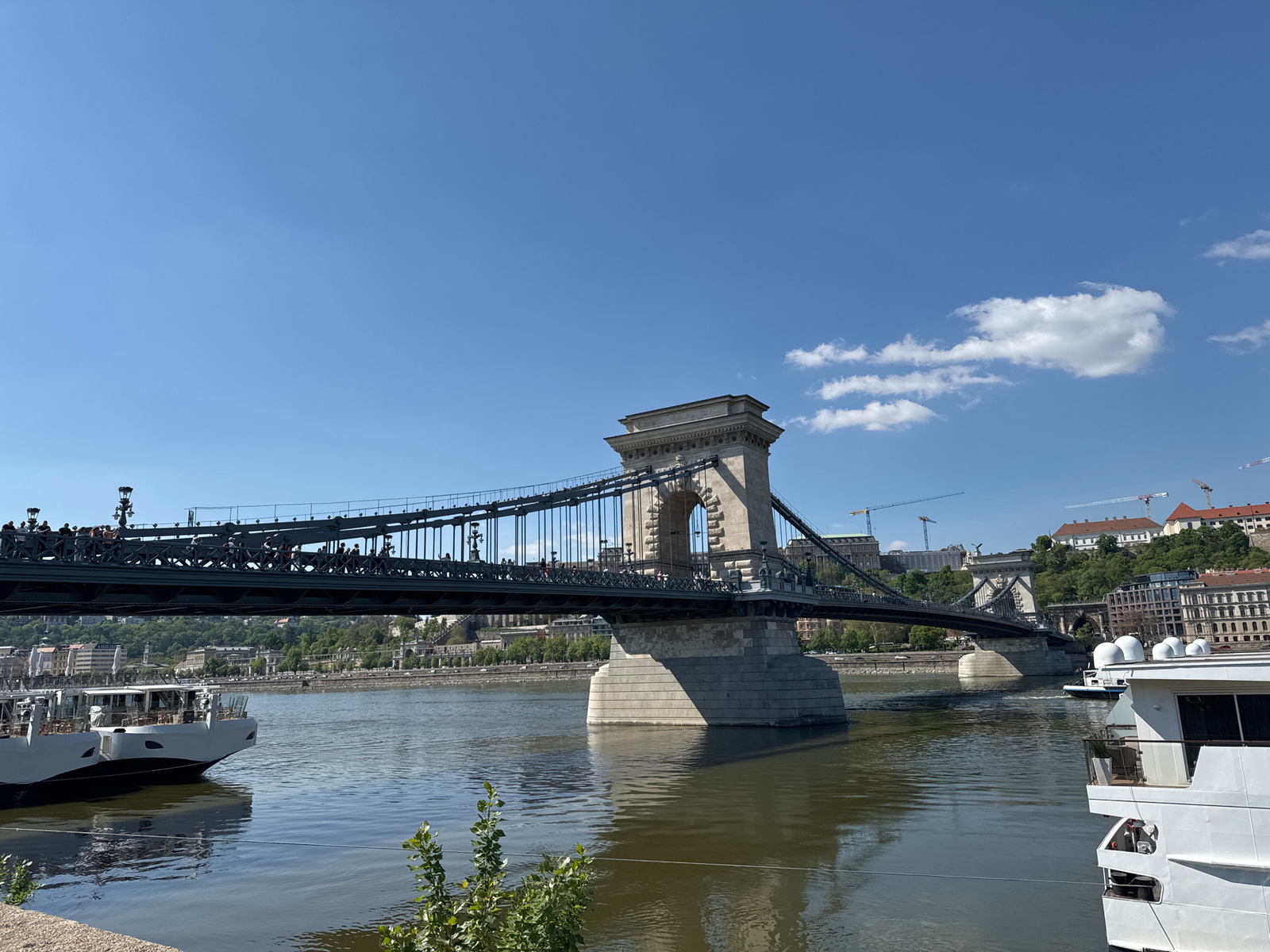 This media file presents a vibrant, sunny view of the Chain Bridge (Széchenyi Lánchíd) spanning the Danube River in Budapest, Hungary. The iconic suspension bridge, a key subject, stretches across the…read more