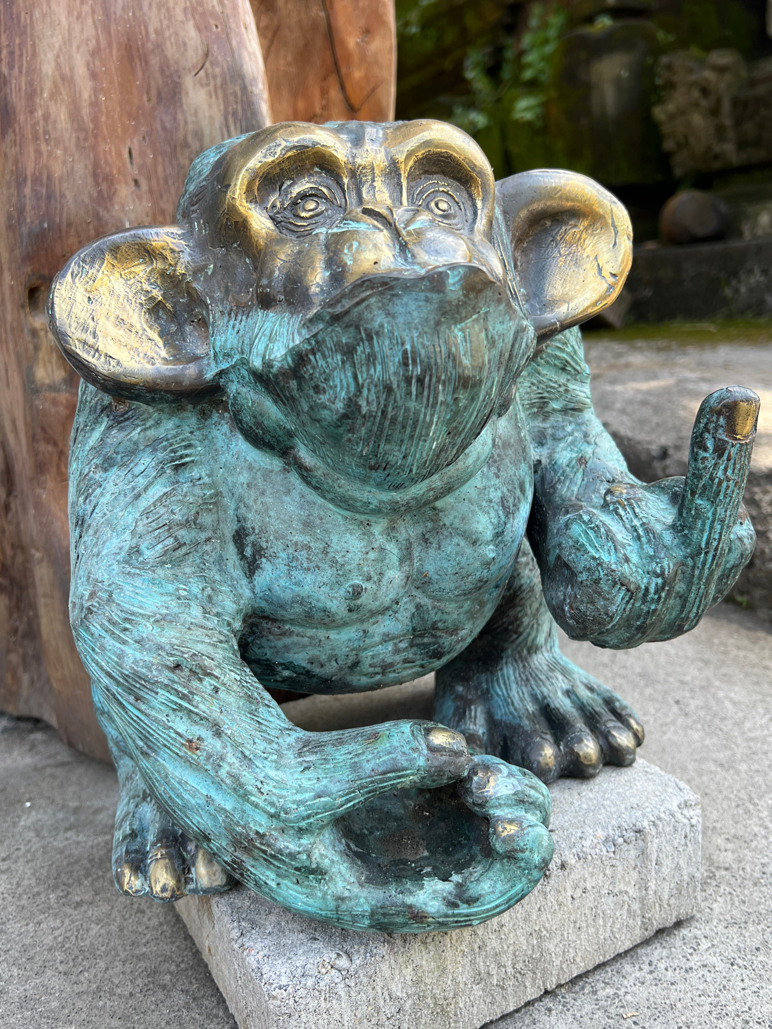 A detailed image shows a bronze statue of an elephant. The elephant is in a reclining position, with its head resting on a wooden surface. One hand is raised in a gesture. The statue has a weathered,…read more