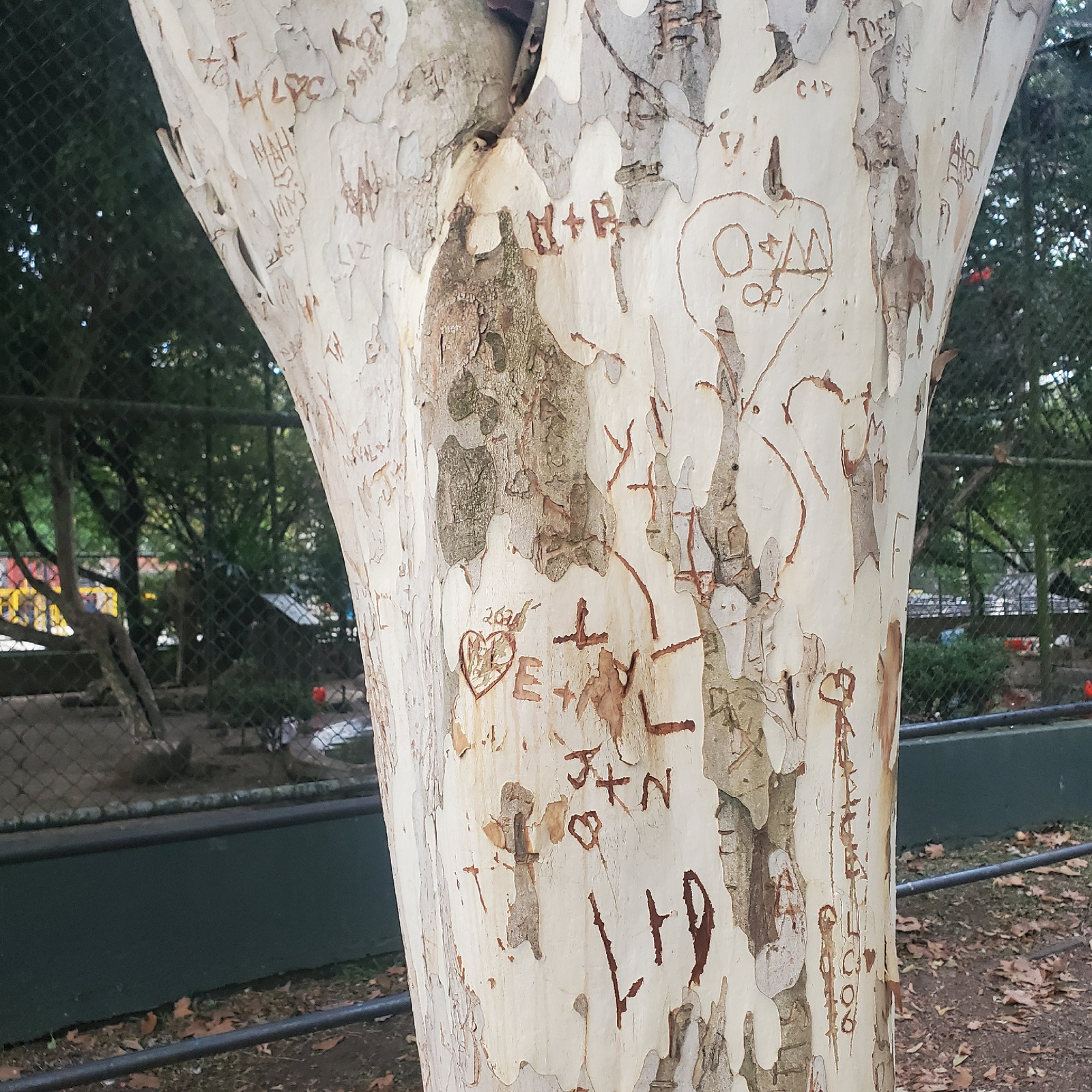 This media file presents a diagonally oriented close-up of a tree trunk heavily covered in carvings and graffiti. The tree features light-colored, smooth bark that is peeling in places, revealing a re…read more