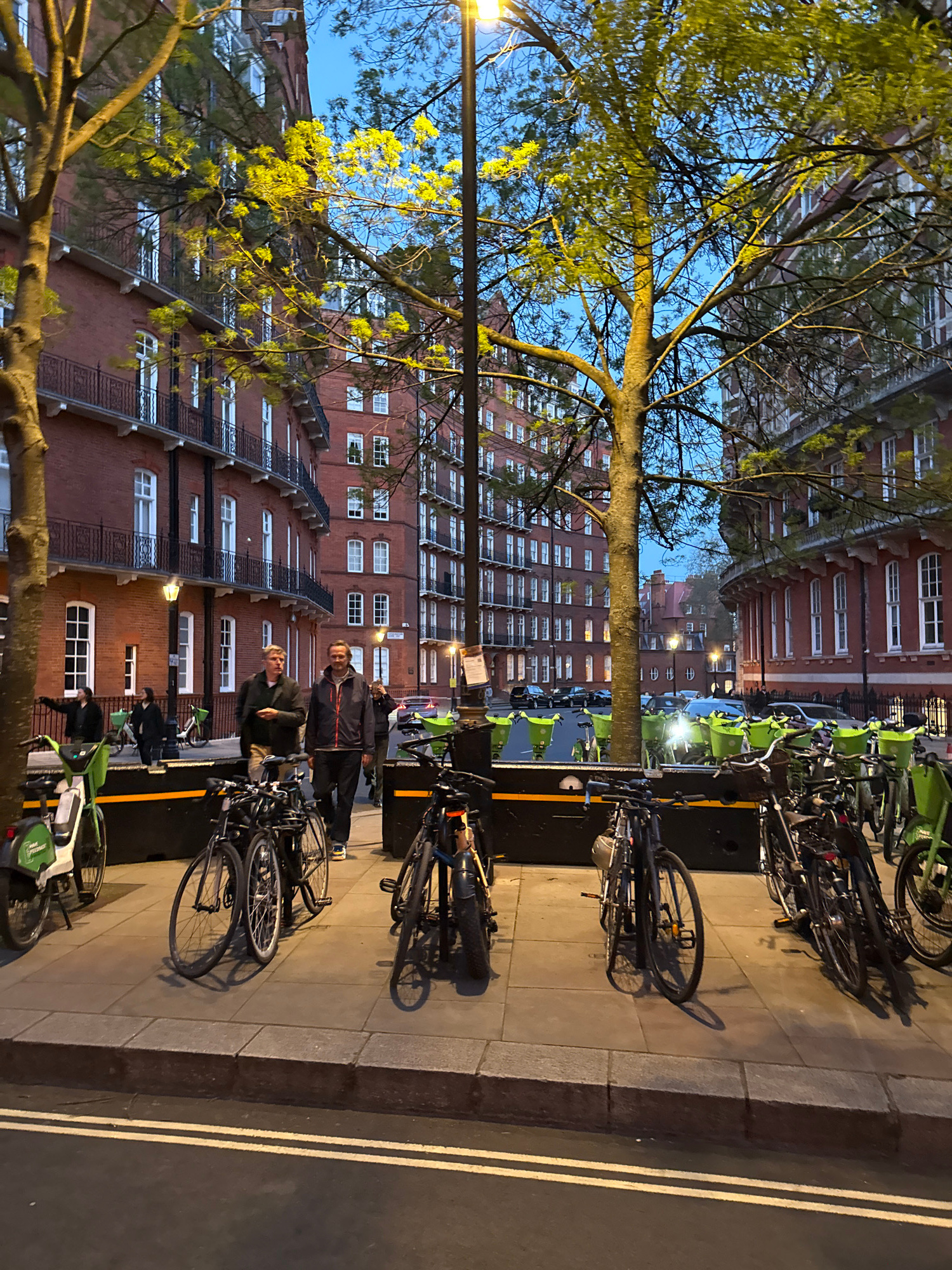 The image depicts a street scene in London, United Kingdom. A row of brick buildings lines the street, with rows of windows and wrought iron balconies. In the foreground, a row of bicycles are parked…read more