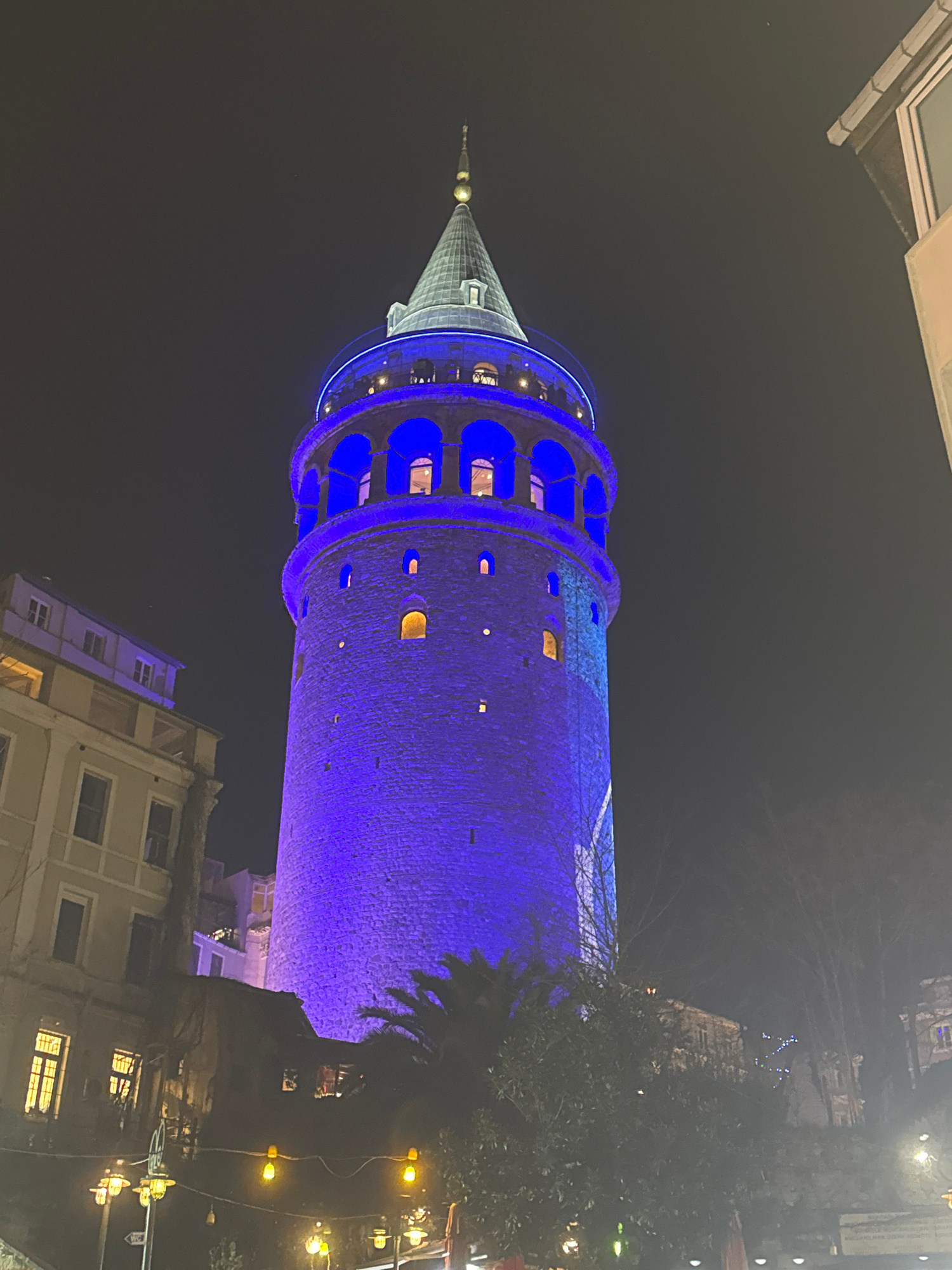 The image depicts the Galata Tower in Beyoğlu, Istanbul, Turkey, illuminated with blue lights at night. The tower is a tall, cylindrical structure with a conical roof. Several buildings and trees are…read more
