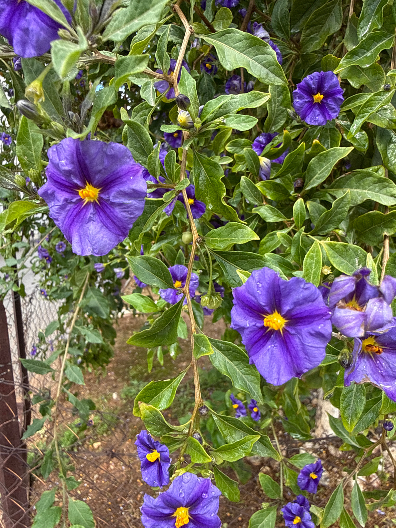 The image shows a close-up of a flowering plant with vibrant purple flowers and green leaves. The flowers have a yellow center. The plant appears to be growing near a fence. The location is likely Cha…read more