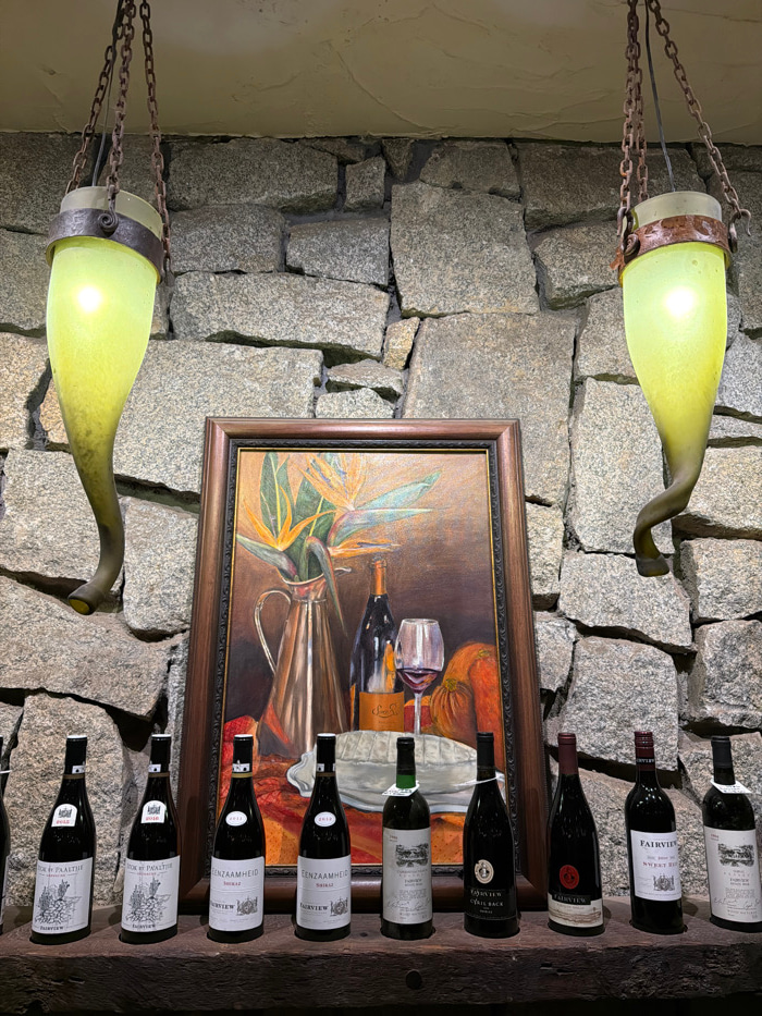 The image depicts an indoor scene within a wine-related establishment, specifically identified as being in Drakenstein Nu, South Africa. The primary background feature is a wall constructed from irreg…read more