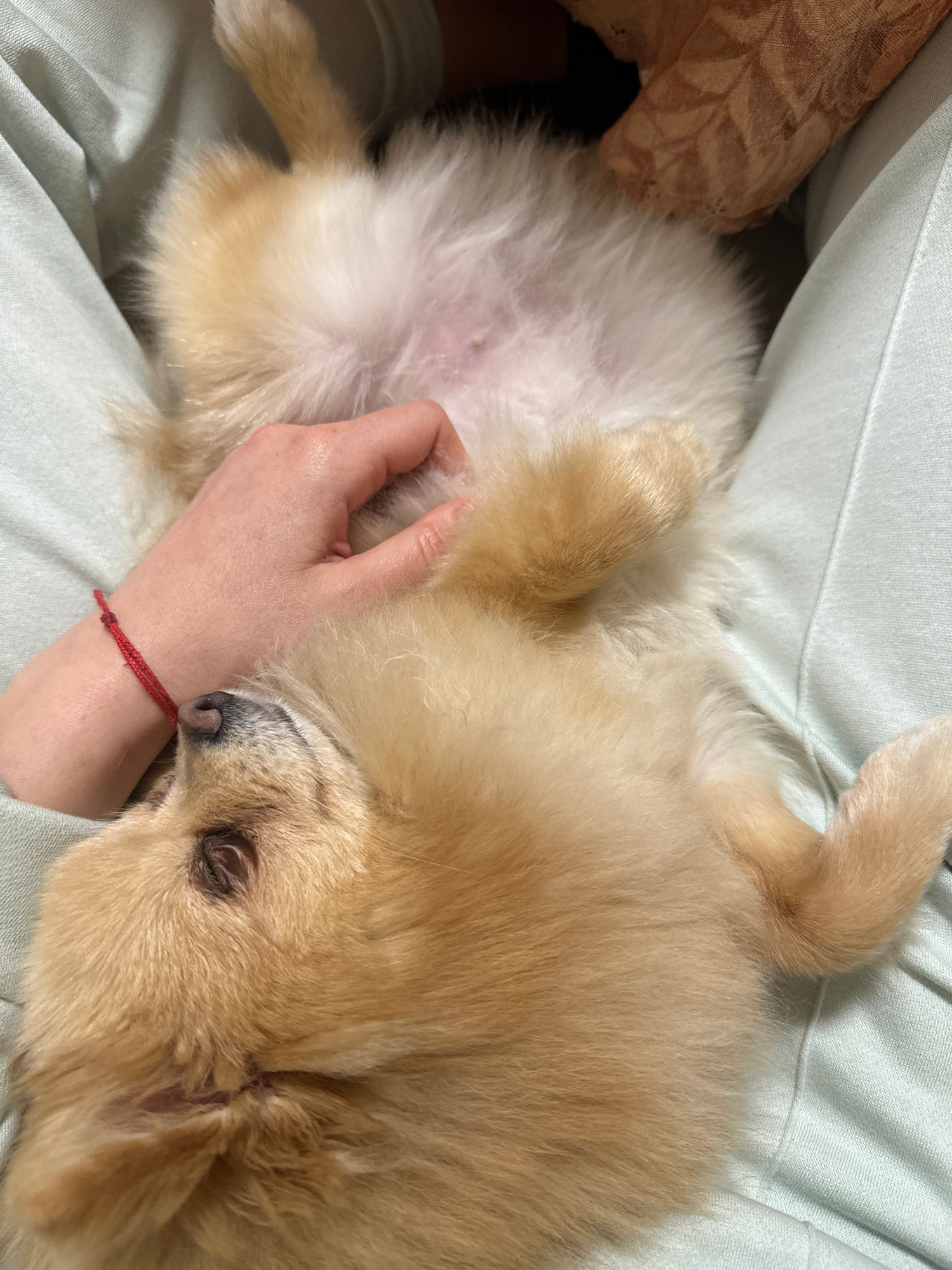 A golden-colored Pomeranian dog lies on its back on a person's lap. The dog's belly is exposed, and the person's hand is gently resting on its side. The person is wearing a light green garment. A red…read more