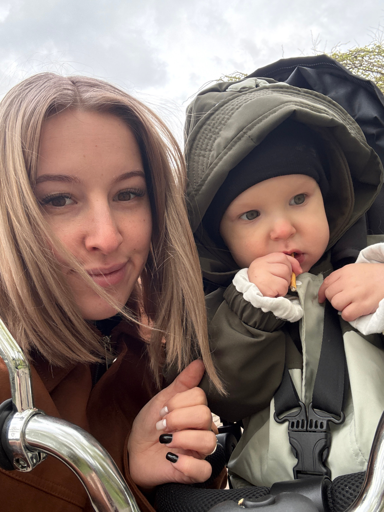 The image shows a woman and a baby outdoors. The woman has shoulder-length blonde hair and is wearing a brown jacket. The baby is wearing a black hat and green jacket, and appears to be in a stroller…read more