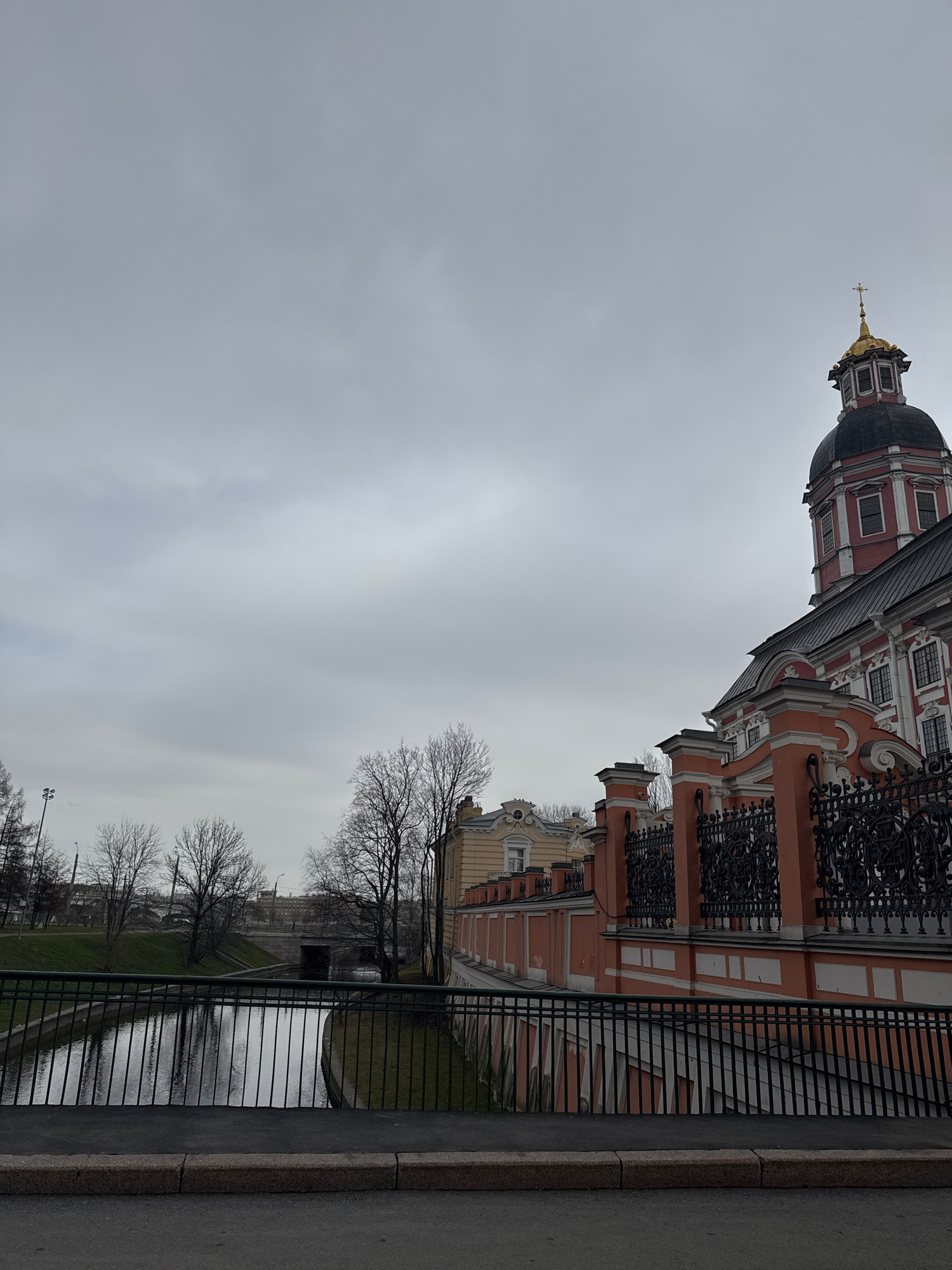 The image shows a view in Saint Petersburg, Russia, looking up at a building with a distinctive architectural style. The building has a red and white facade, intricate wrought-iron balconies, and a go…read more
