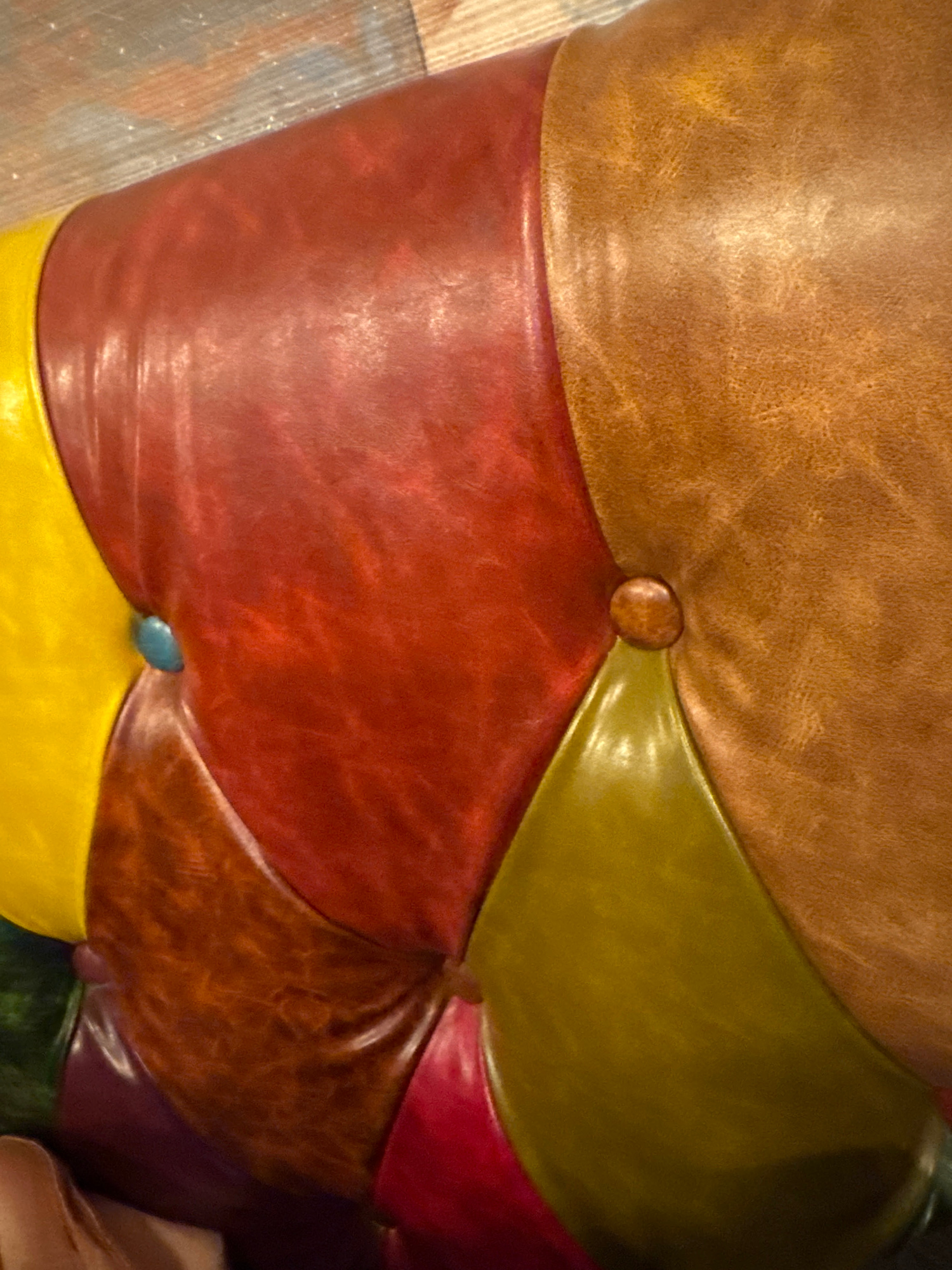 The image shows a close-up of a multi-colored leather or faux-leather upholstered surface. The colors present are brown, red, yellow, green, and burgundy. The upholstery is tufted with buttons holding…read more