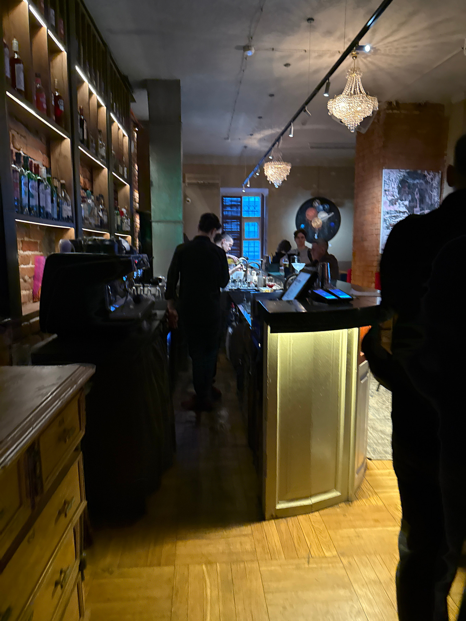 The image displays the interior of what appears to be a stylish bar or restaurant in Moscow, Russia, captured during the evening or night. The scene is illuminated by warm, artificial light, primarily…read more