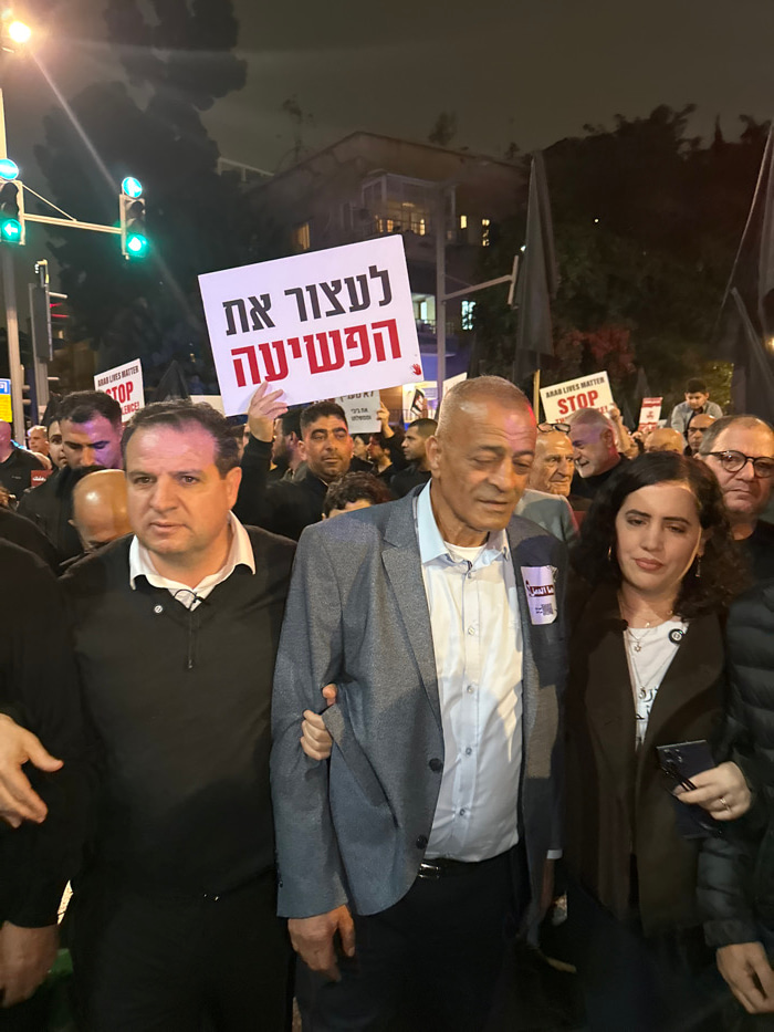 A group of people is gathered at night. Several are holding signs, one of which reads in Hebrew to "Stop the Crime." There are also signs stating "Arab Lives Matter" and "Stop". The crowd appears to b…read more