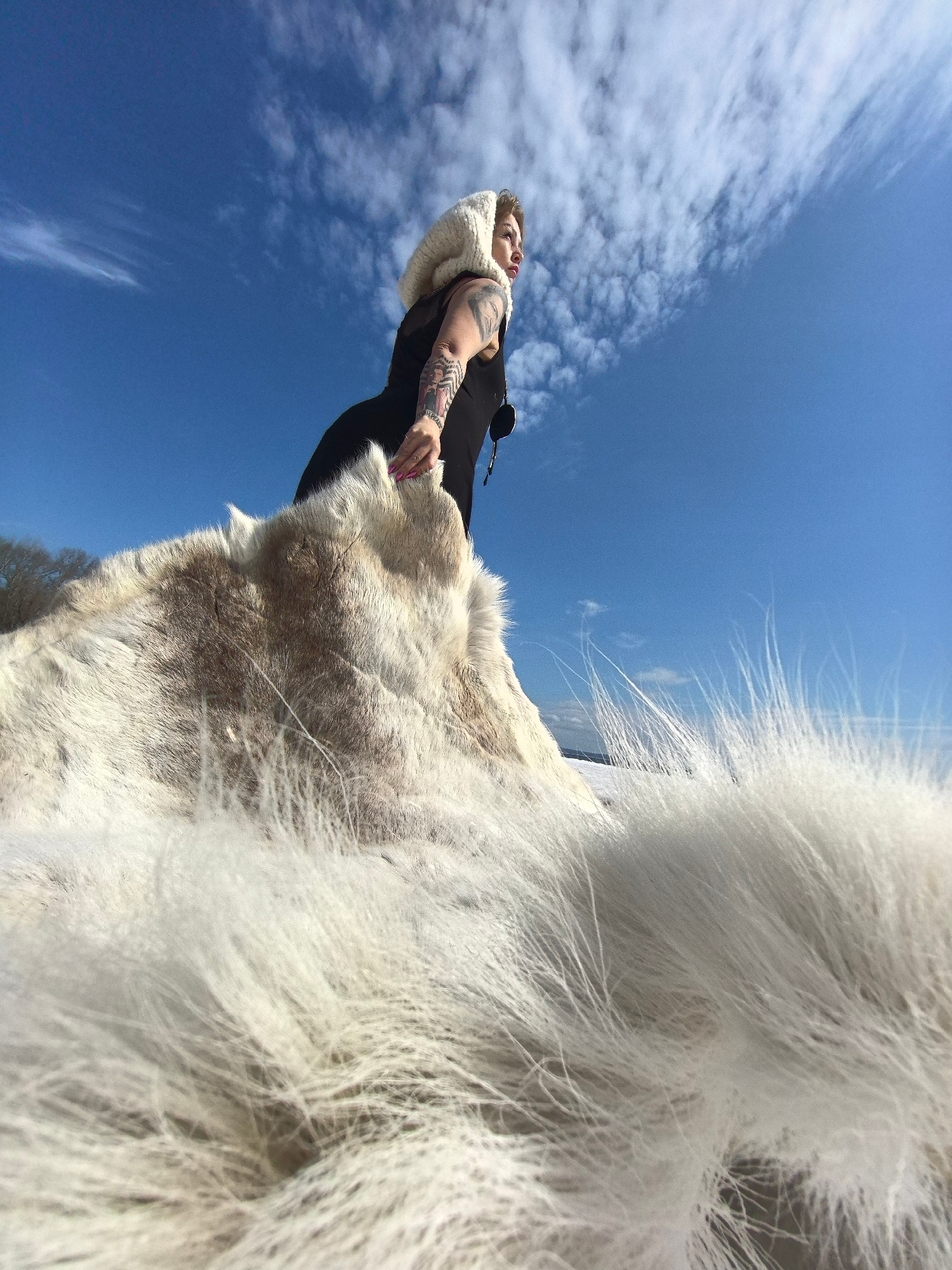 This wide-angle, low-angle outdoor photograph features a woman posing with a large fur spread across a white, possibly snowy, landscape under a vast blue sky. The woman, positioned in the mid-ground o…read more