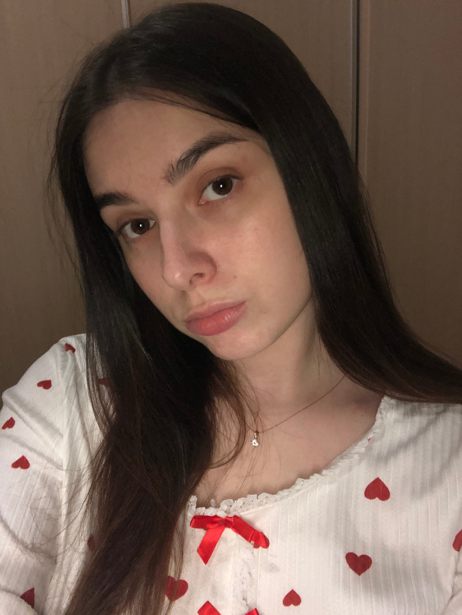 A woman with long, dark brown hair is photographed indoors, wearing a white garment adorned with red heart patterns and a small red bow. She is positioned at an angle, with her head tilted to the side…read more