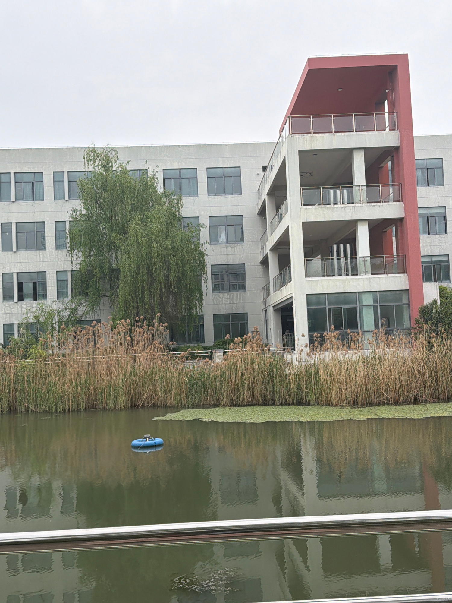 The image shows a large, modern building with a red and white exterior, likely located in the Jiangning District of China. The building has multiple floors and numerous windows. A body of water, possi…read more