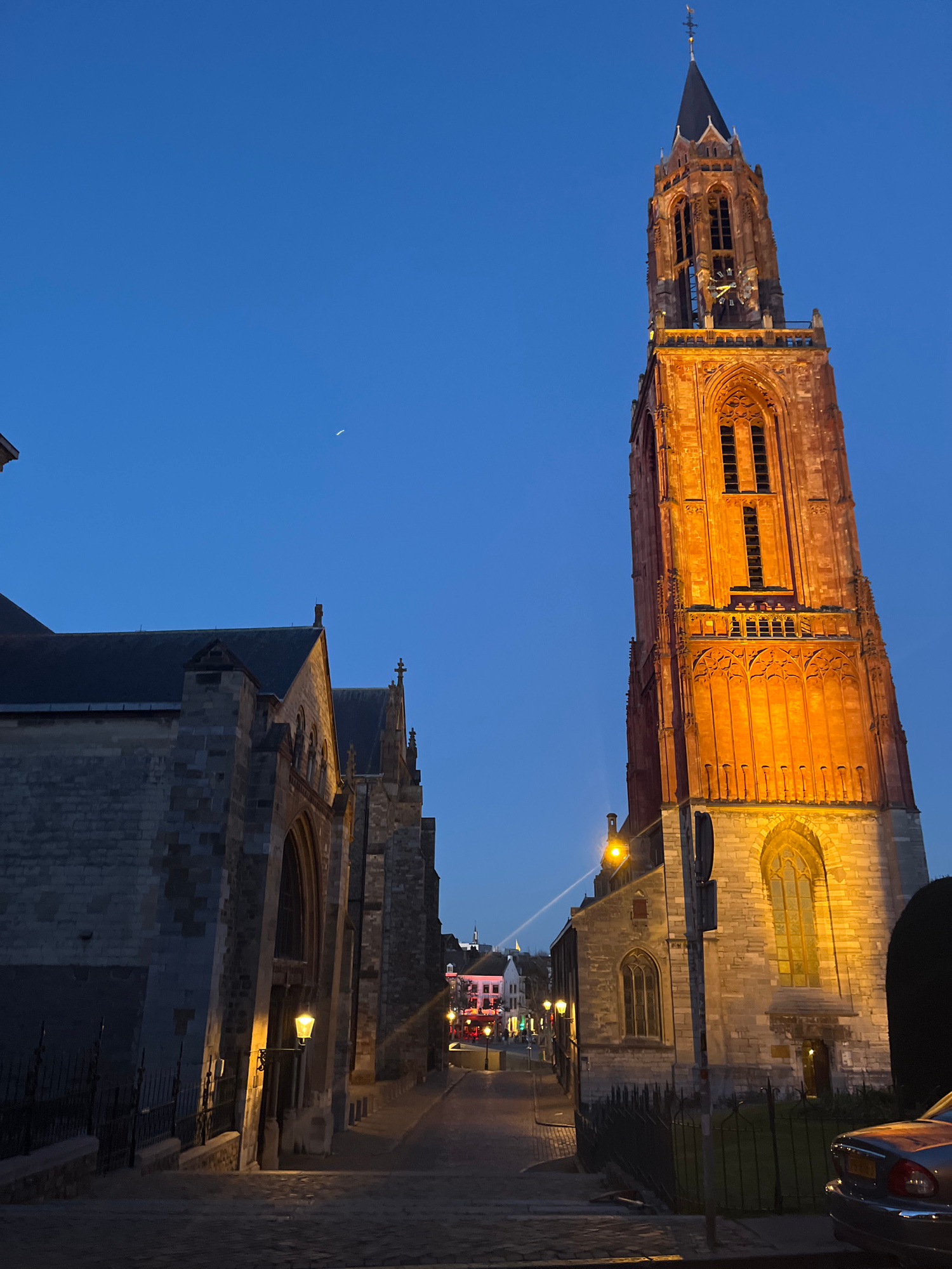 The image depicts a nighttime view of Maastricht, Netherlands, specifically featuring the Sint Janskerk (St. John's Church) and the adjacent Sint Servaasbasiliek (Basilica of Saint Servatius). The Sin…read more