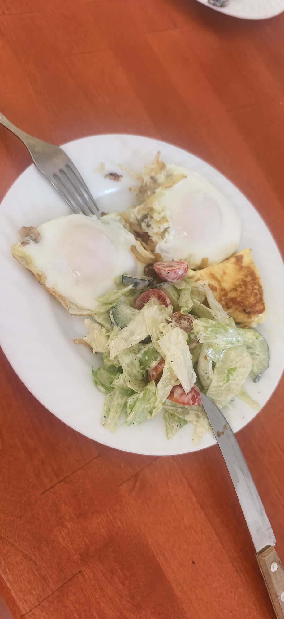 The image shows a plate of food on a wooden surface. The plate contains two fried eggs, a piece of omelet, and a salad with lettuce, tomatoes, and cucumbers. A fork and a knife are also present on the…read more