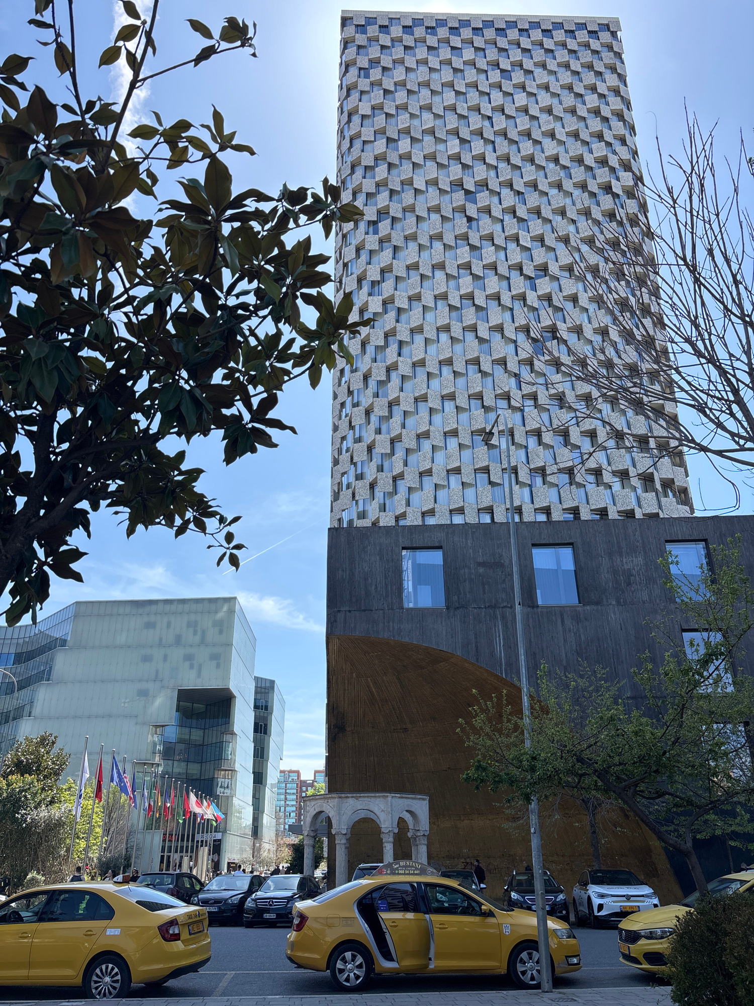 This is an upward-facing photograph taken in Tirana, Albania. Dominating the left side is the upper portion of the TID Tower, characterized by its patterned facade of gray and white geometric shapes.…read more