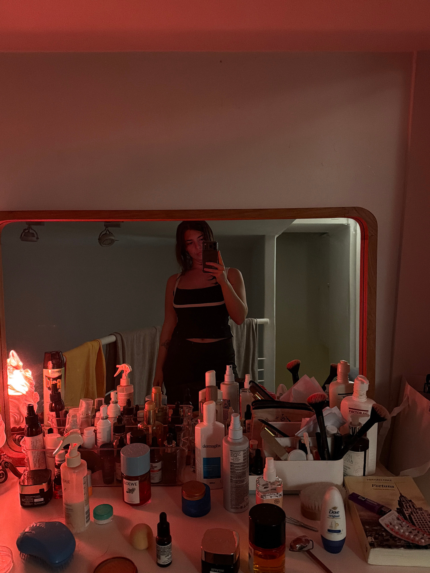 A person is reflected in a mirror surrounded by toiletries. The person is holding a phone to take a picture. The mirror is on a wall. It's impossible to determine from the image where this is located…read more