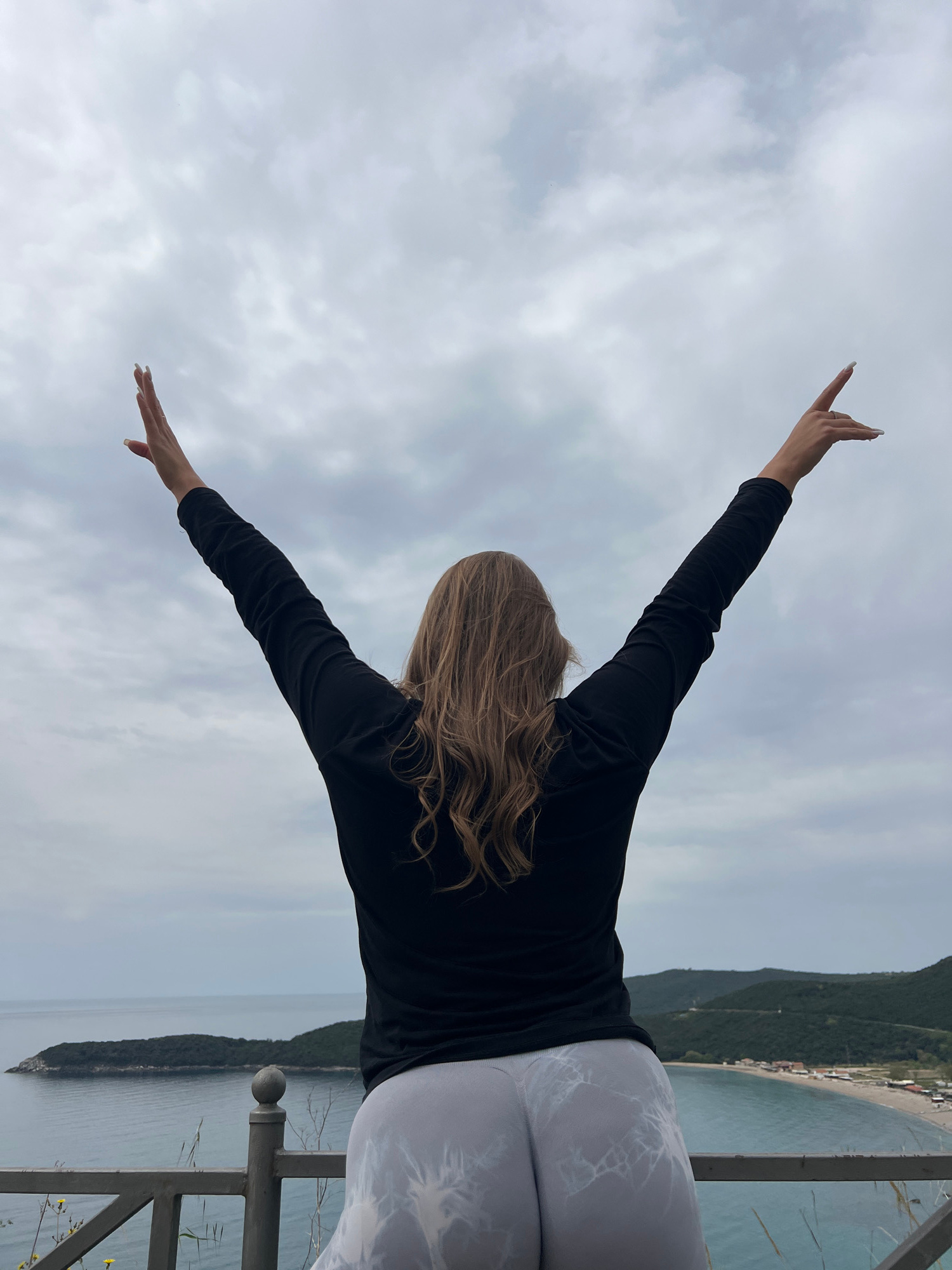 A woman with long blonde hair stands with her back to the camera, arms outstretched in a "V" shape against a cloudy sky. She wears a black long-sleeved shirt and gray leggings with a white pattern. Sh…read more