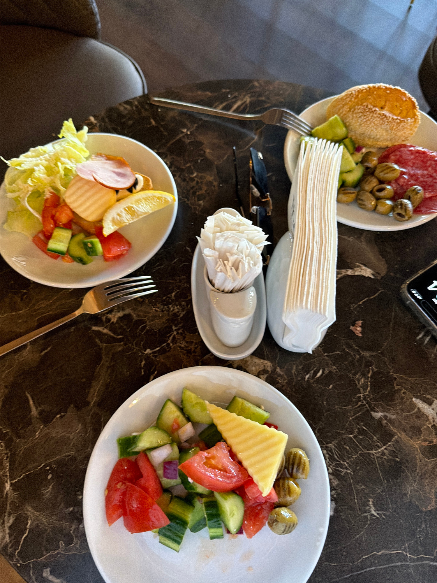 The scene is a table setting, likely in a restaurant or lounge, with a dark marble or marble-patterned surface. Three small white plates are visible. The plate on the upper left contains a bread roll…read more