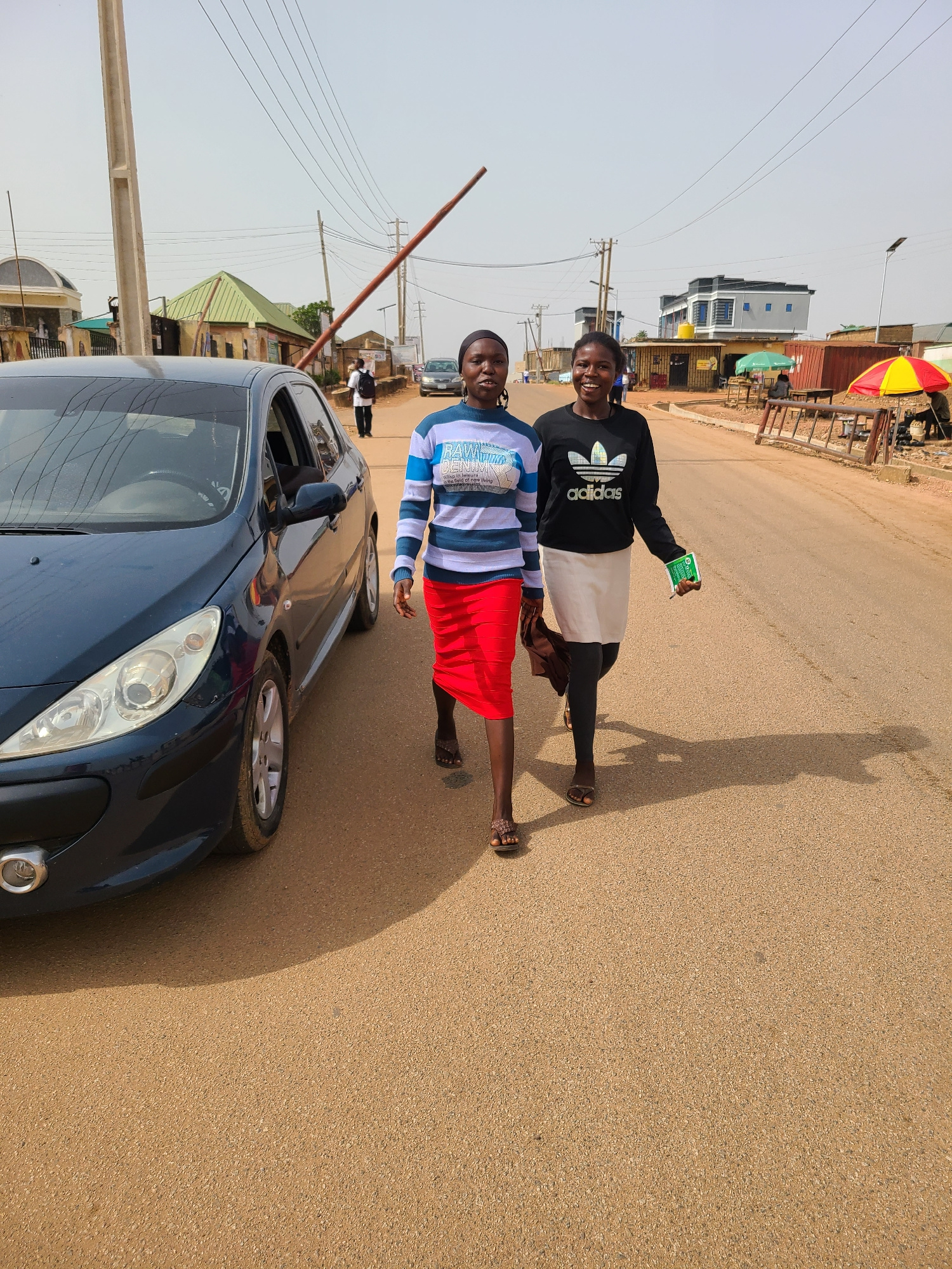 Two young women stand next to a dark blue car on a paved road in Jos, Nigeria. The woman closest to the camera wears a striped blue and white shirt and a red skirt. The other woman wears a black Adida…read more