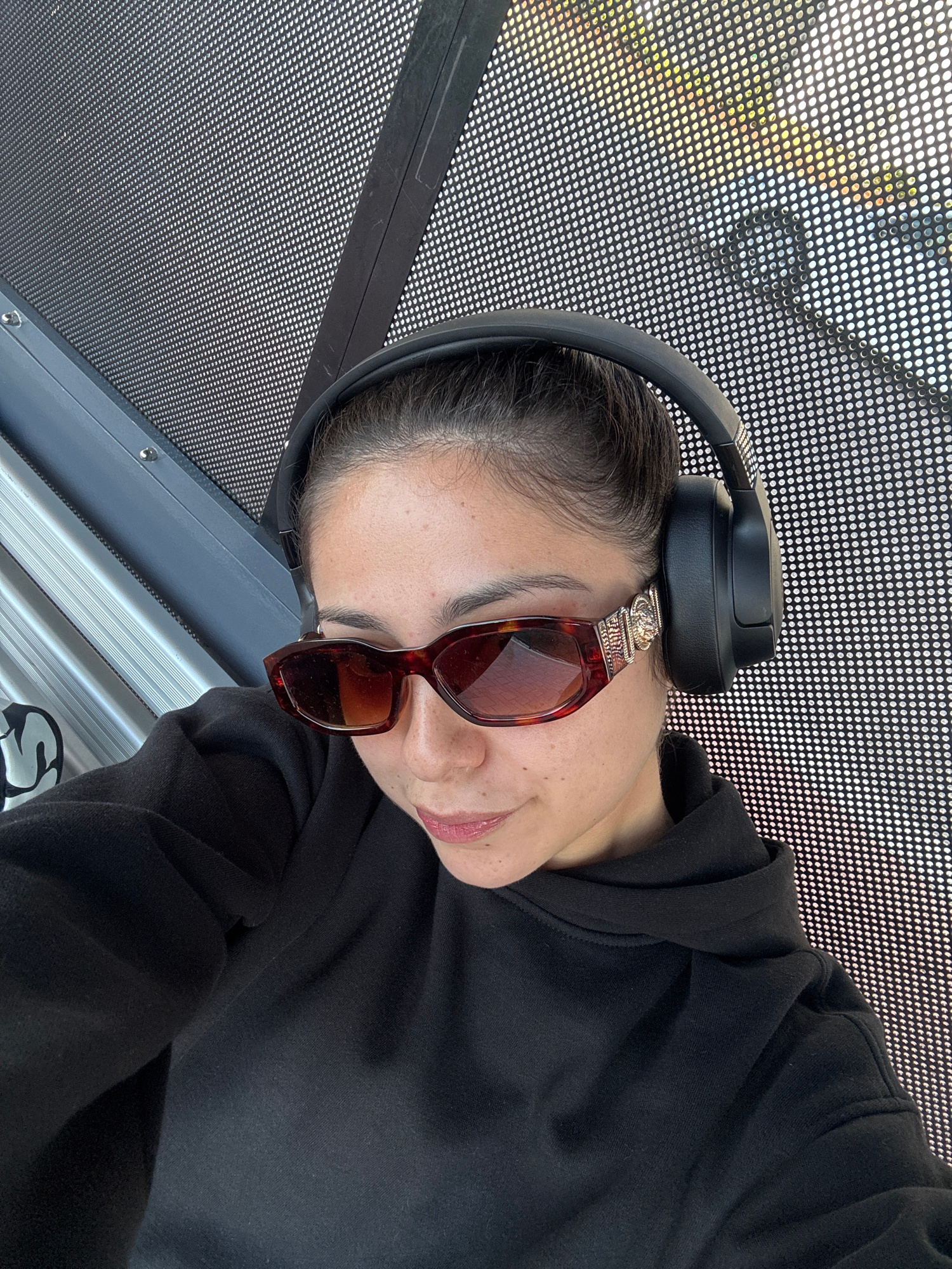 A person is wearing sunglasses and headphones. The person is inside a vehicle with perforated metal sheeting. The location is Wellard, Australia. The time of day is daytime. The person is wearing a bl…read more