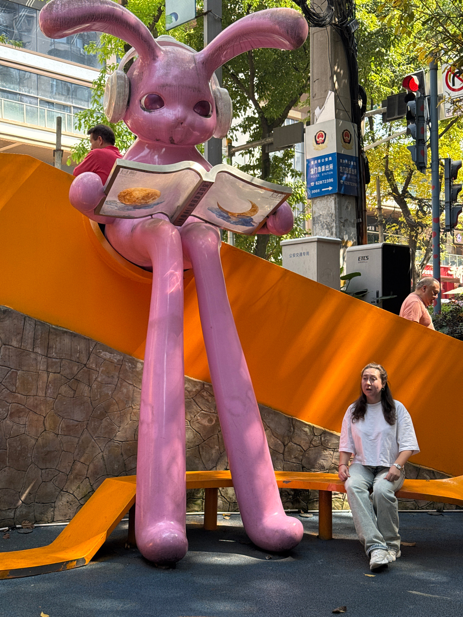 The image, rotated 90 degrees clockwise, presents a bright, sunny outdoor urban scene, likely in Nan'an District, China. The central focus is a large, whimsical pink rabbit sculpture wearing headphone…read more