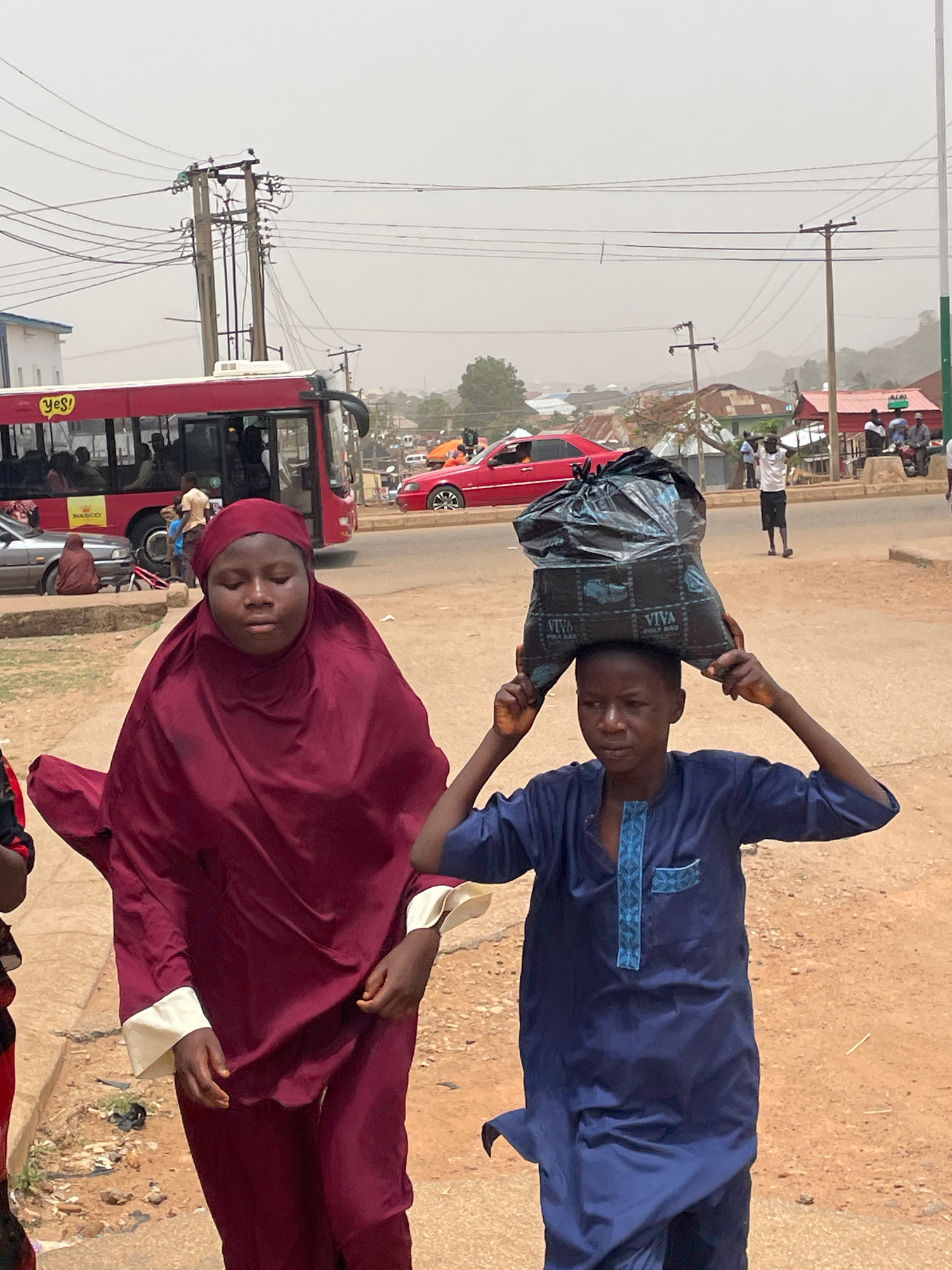 The scene depicts a bustling street in Jos, Nigeria, under a hazy sky with overhead power lines. A young man balances a black plastic bag, marked "VIVA," atop his head, using his hands for support. He…read more