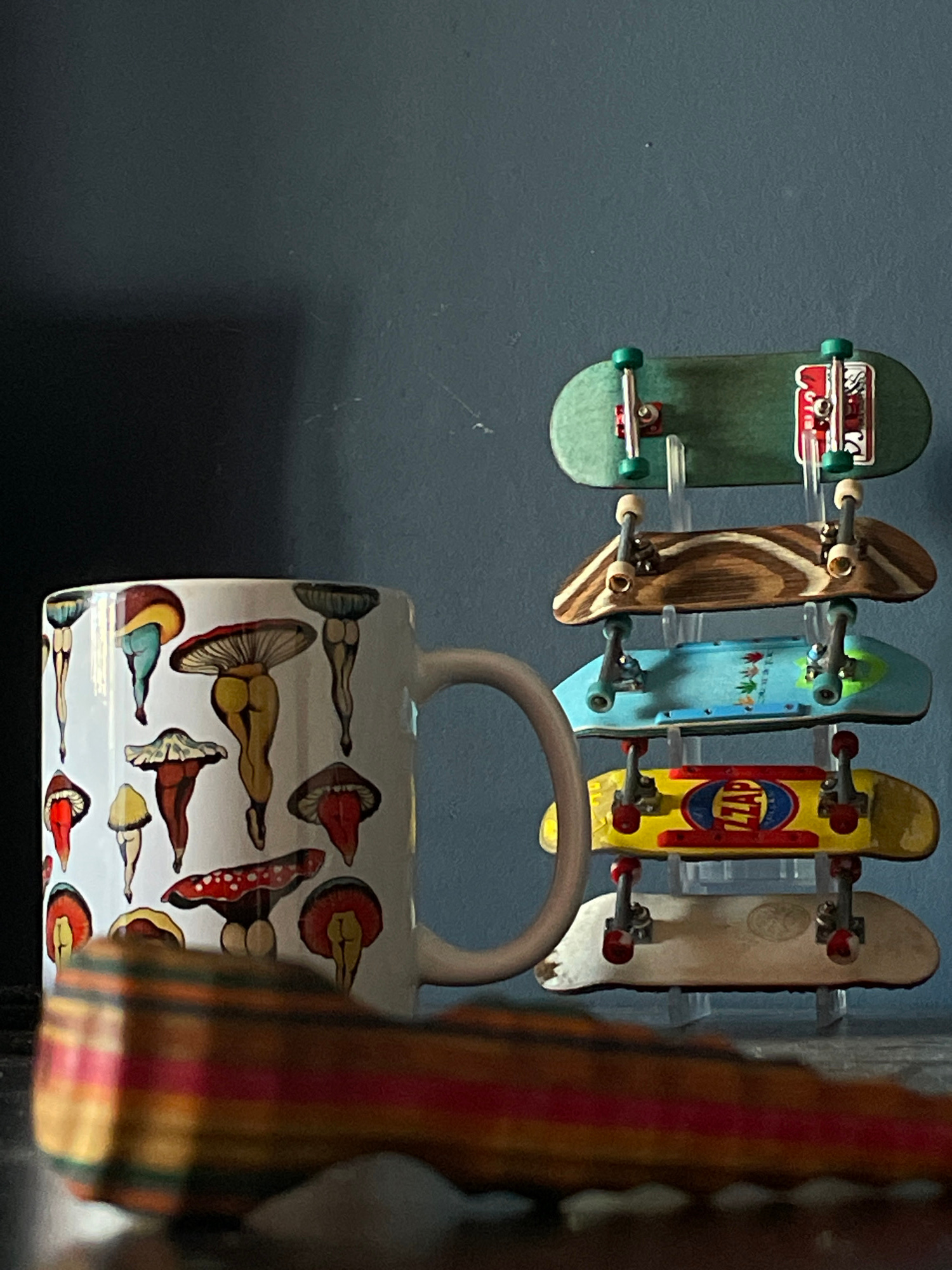 A medium shot shows five finger skateboards hanging on a wall above a ceramic mug decorated with mushroom images. The skateboards are arranged horizontally, facing the viewer. From left to right, they…read more