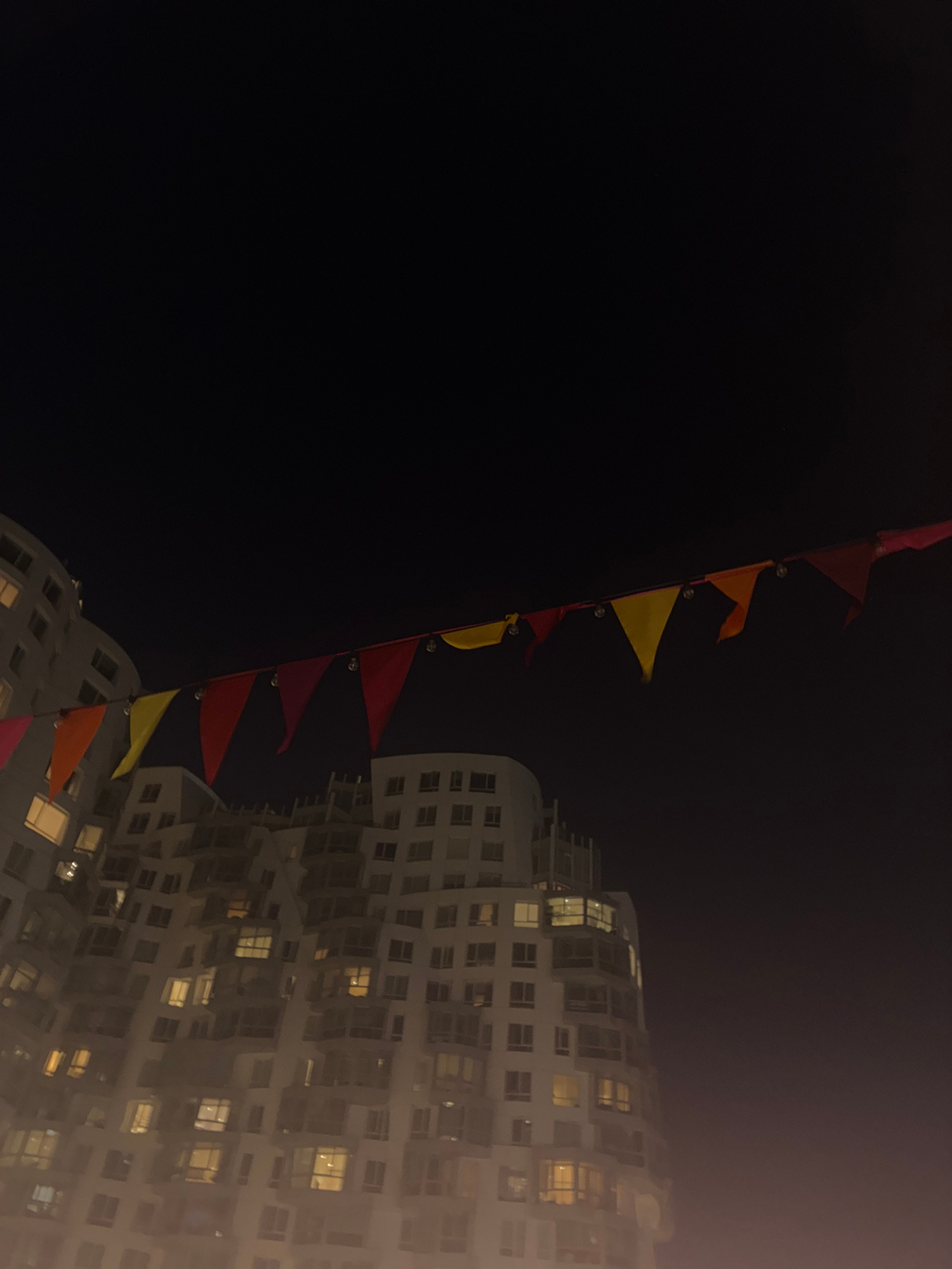 The image shows a night scene with a building and string lights. The building is modern, white, and multi-story with numerous lit windows, suggesting it is either residential or an office space in use…read more
