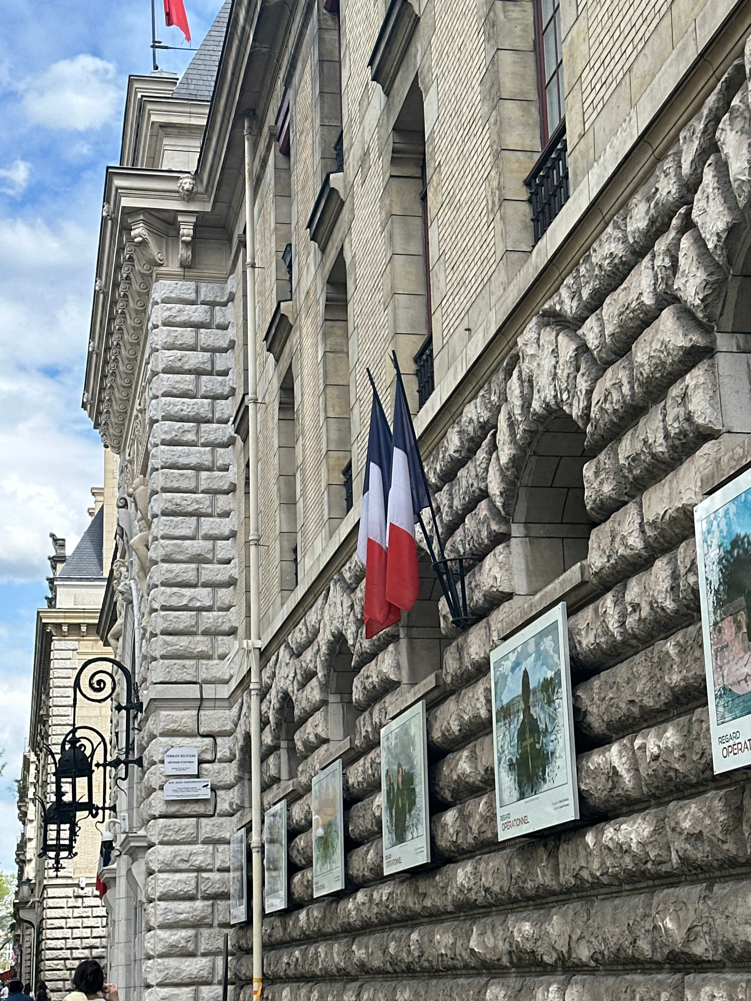 An outdoor scene in Paris, France, captures a grand stone building under a bright, partly cloudy sky. The building exhibits intricate classical architecture, featuring rough-hewn, textured stone block…read more
