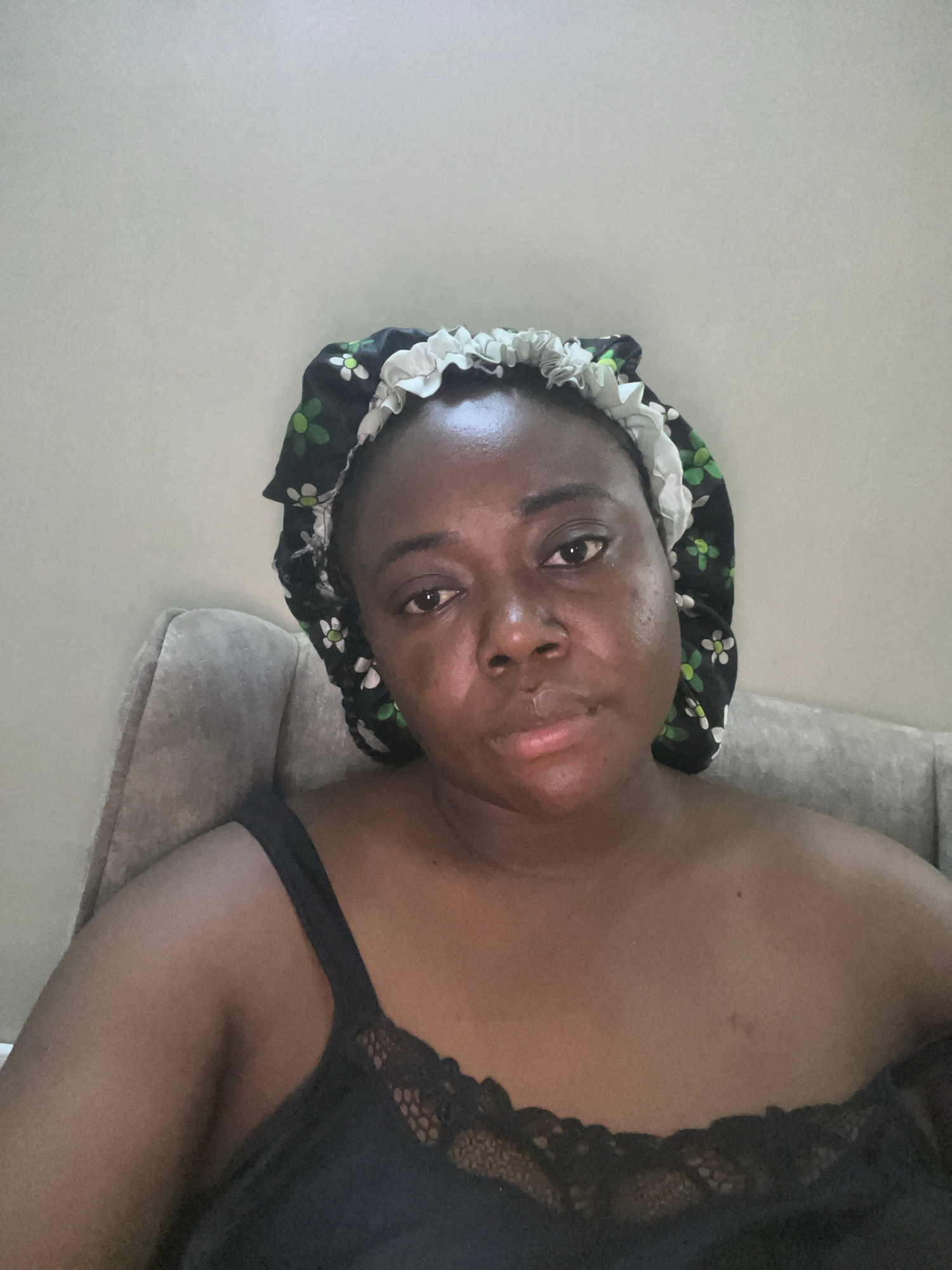 An indoor portrait features a dark-skinned individual, likely an adult female, lying down and looking directly at the camera. The image is oriented with the person on their left side. The subject is…read more