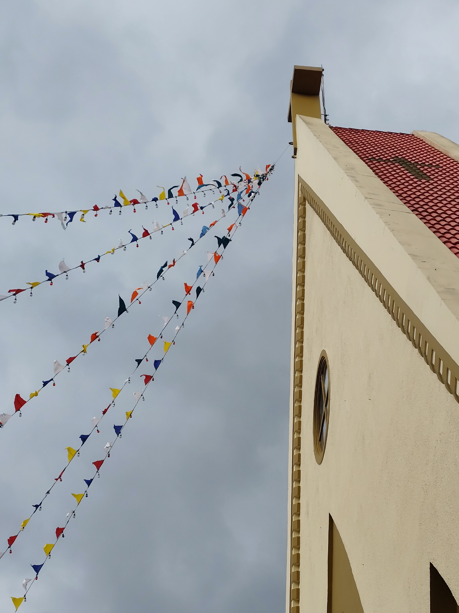 A low-angle shot shows a building and strings of flags under an overcast sky. The building is beige with a red tile roof and a circular window. Strings of colorful pennant flags are strung from the bu…read more